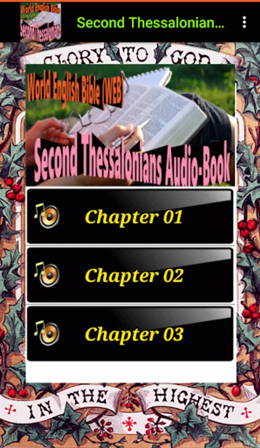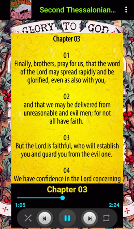 An app for anyone who want to know about Christianity directly from the source (Bible). Enjoy Complete chapter of Second Thessalonians (The second Epistle to the Thessalonians) in good quality audio with transcript (text). Enjoy the beauty of God's word anytime and everywhere -- even without internet connection (offline) -- via your Android gadget. This app presents you the complete chapter of Second Thessalonians based on World English Bible (WEB). You can enjoy it all in quick, simple, and easy way. A must for devoted Christian soul.