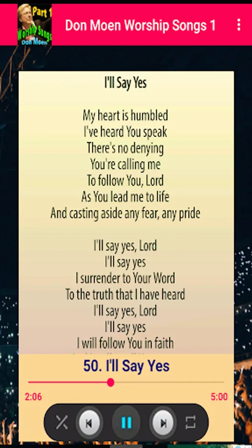 Worship Songs Don Moen Part 1 offers complete collection of Praise and Worship Songs by popular Gospel singer, Don Moen. Install and enjoy popular Praise and Worship Songs ( Gospel Songs) for Christian Soul. Enjoy the best of Christian music and church songs. Enjoy Christian Songs by Dan Moen in high quality offline audio with song lyrics and ringtone feature.