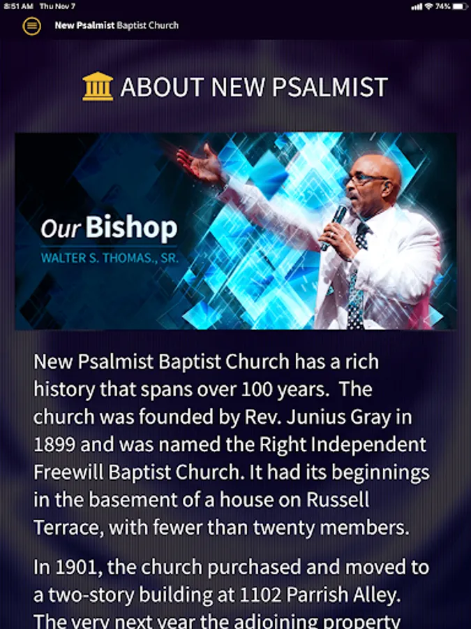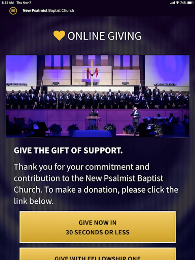 Don't wait another moment to get the nourishment you need for your day! The New Psalmist Baptist Church app will give you access to ministry information and events as well as special video content viewable 24/7/365...right from your phone or tablet. New Psalmist also invites you to join us LIVE from the app for our worship services every Sunday and at other scheduled times.