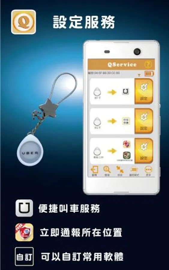 您可以將QService 智慧按鈕掛在您隨身物品上,比如行李包,電腦包,手提包、鑰匙,錢包等,當您需要叫車服務時,或是需要通知您所在的位置給親友時,都可以透過智慧按鈕的按壓方式,透過藍牙4.0立即發送您所需要的服務。