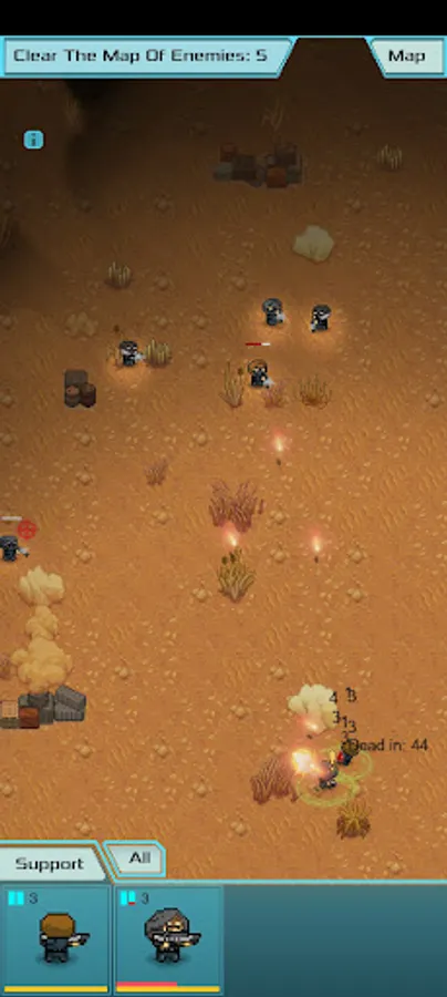 Your tiny characters / avatars have their own behaviors, but is not like any idle game. They manage themselves, they shoot, find cover, reload, heal, revive teammates, etc. You have to be careful and tactically give them orders on where they should operate, what equipment they should be using, and what support to call in.