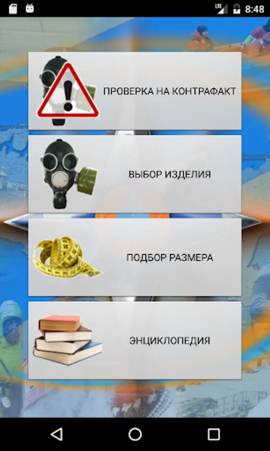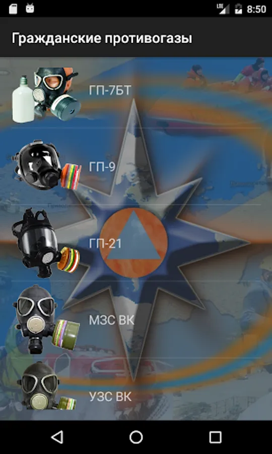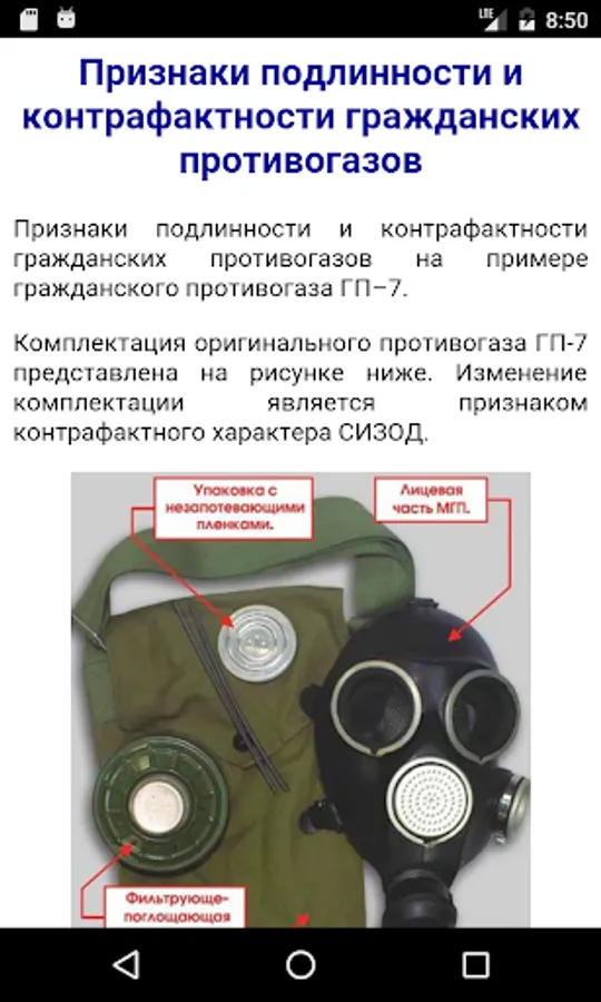 The application contains a reference and training materials for signs of counterfeit and genuine products among PPE - civil gas masks, normative legal acts in the area of civil defense and protection of the population from emergency situations involving radiological, biological or chemical contamination.
