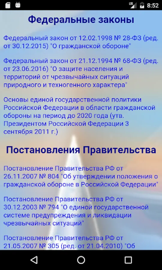 The annex presents the federal laws, decrees of the Government of the Russian Federation, orders and guidelines EMERCOM of Russia, as well as a tutorial Department of Management in Crisis Situations of the Ural Institute of the State Fire Service of EMERCOM of Russia in the selection, storage, retention and use of resources to protect the population.