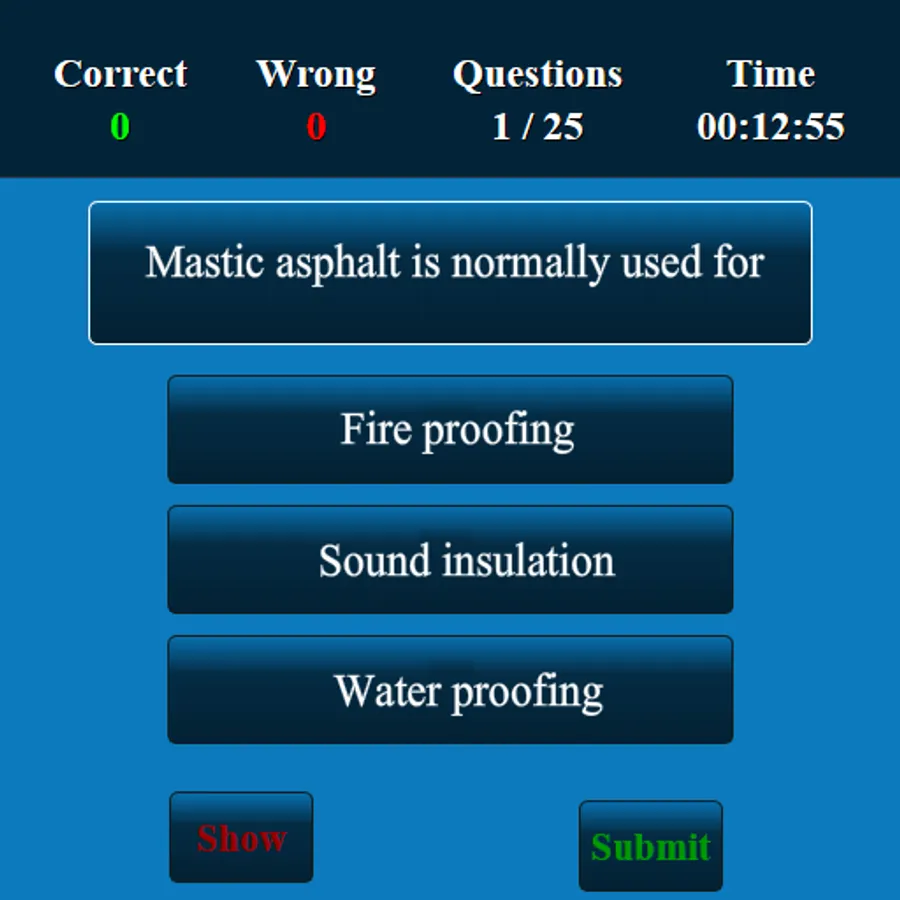 This Civil engineering app has been developed for testing your skills of Civil engineering. This app has more than 10,000 multiple choice questions and answers. This Civil engineering quiz app suits for all lower, intermediate and higher levels. The questions at all levels will be displayed randomly. The user can improve Civil engineering knowledge and user can score well in college and competitive level examinations. This is a free version and you can be used in both offline and online.