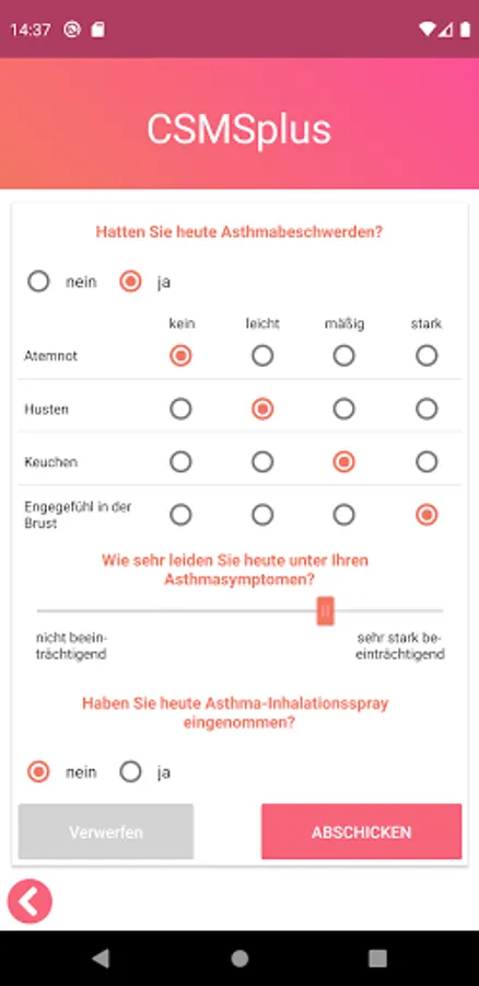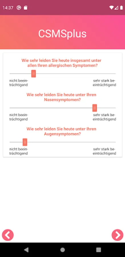 In the CSMSplus App, this parameter is combined with the validated Visual Analogue Scale for the rating of allergy symptoms. This enables the patient to individually determine his allergy symptoms on a day-to-day basis.