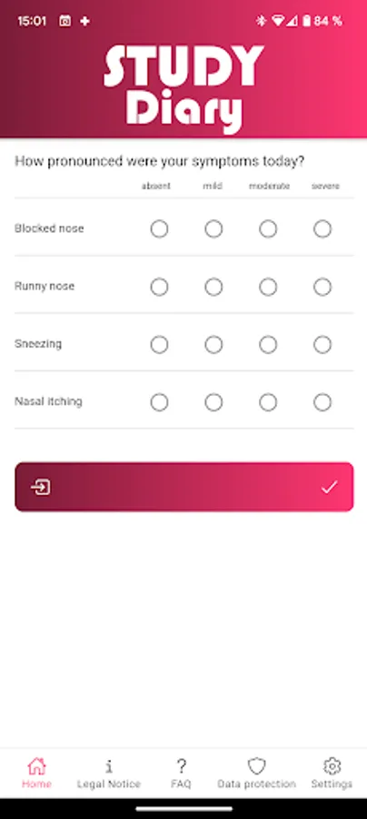 This App is designed to simplify the timely and accurate documentation of your symptoms (e.g., acute viral rhinosinusitis or grass pollen allergy) and provide the most accurate data possible for clinical research. In addition, the use of study medication as well as the use of medication for symptom control can be documented depending on the study.