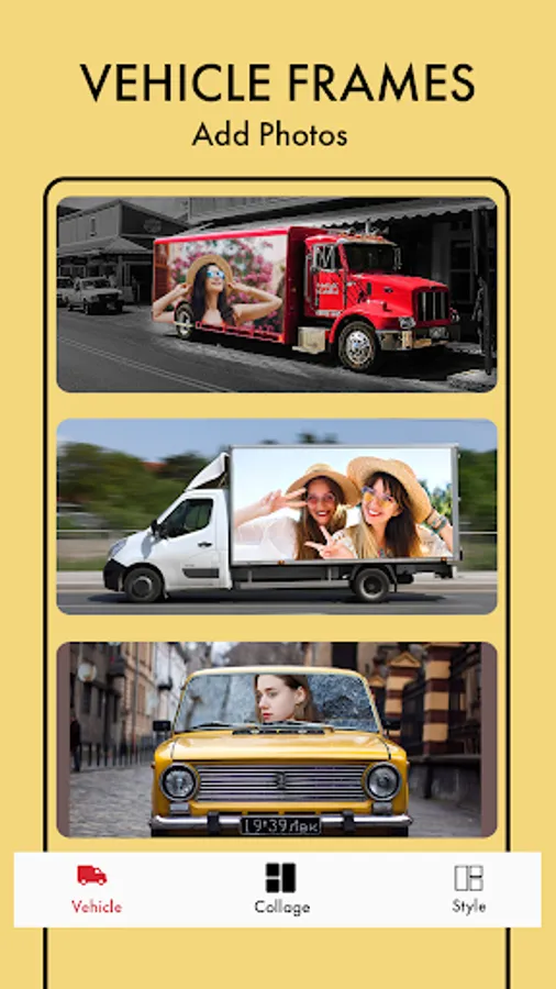 Splash your photos on vehicle and show your self as an star . You can decorate your pictures with high quality frames, which will make you feel your photos are hung on vehicle display. Cool range of frames are available of different types of vehicles. Impress your family and friends with these fun and original photo frames. You have not seen any like these, your photos will be unique, the funniest and cheerful.