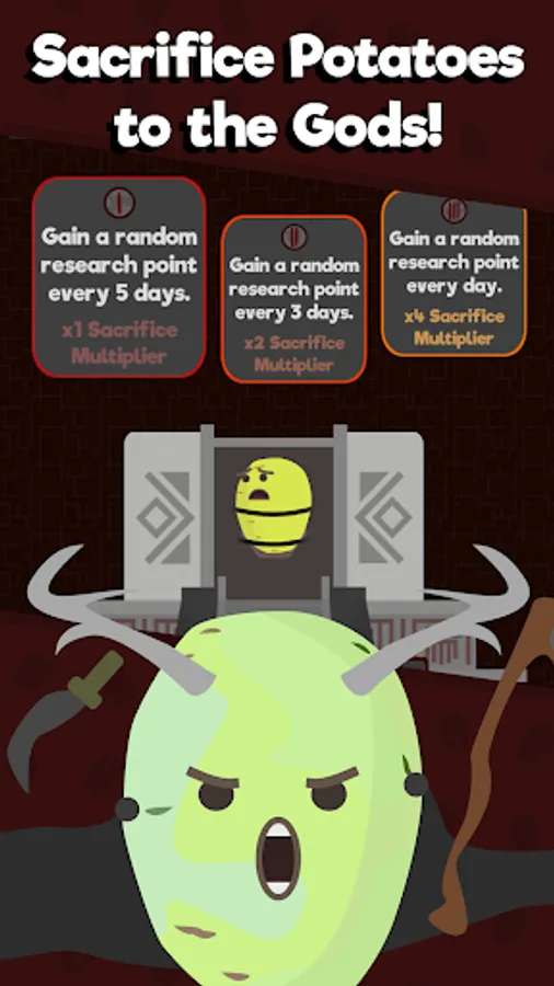 The potatoes follow a very strict faith and will pray to deities that require potato sacrifices daily. Choose your potato god to get your favorite bonuses, and above all else, make sure you have enough sacrifice!