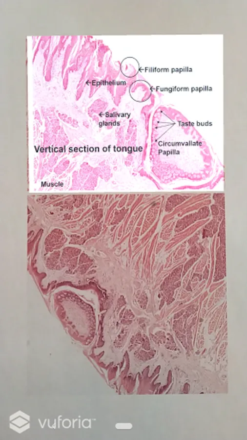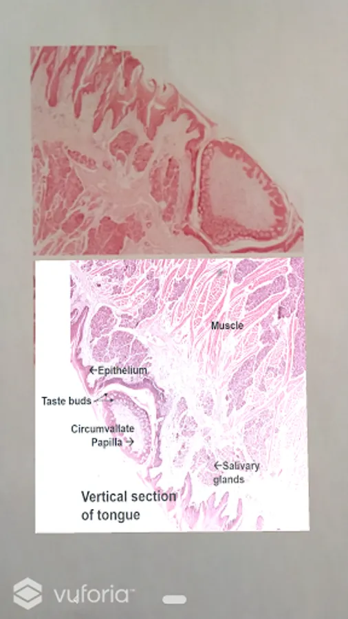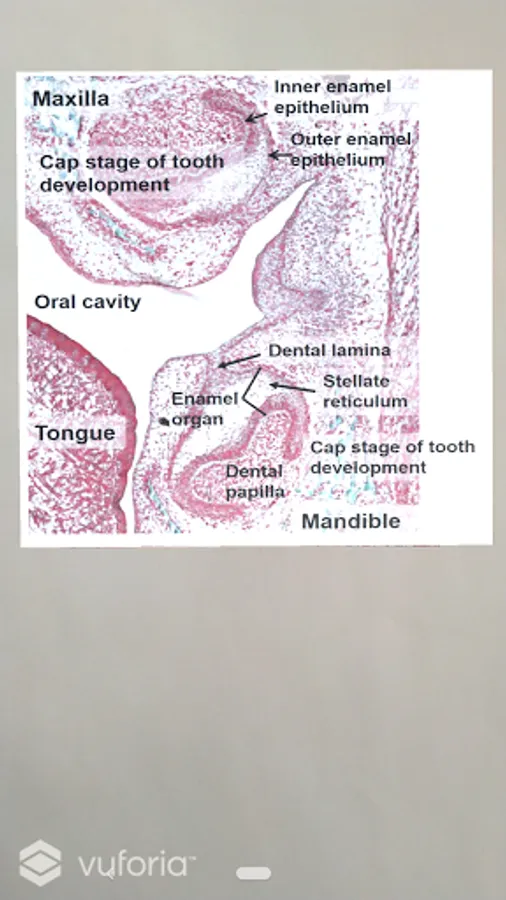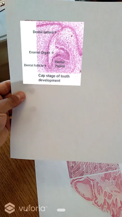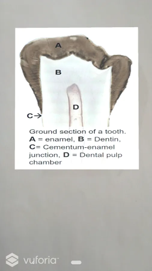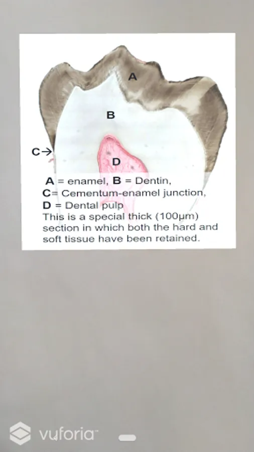 This augmented reality application enhances dental histology flash cards by providing labelled information on top of bare histological images. The labelling detail overlaid on top of the images allows students to study easier - the physical flash cards that can be printed off from the class instructor are bare histology images for students to label, and when the student is ready to test themselves, this app provides labelling of the structures in the images using augmented reality.