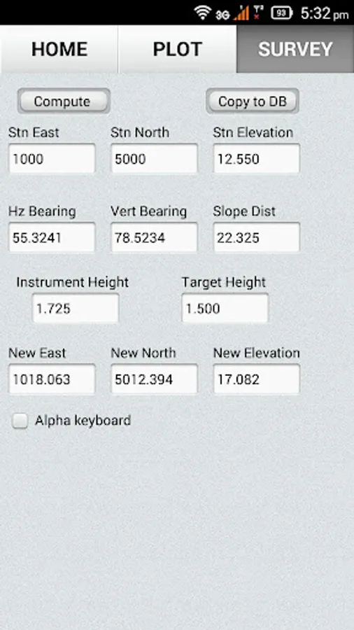 Survey---> Convert field data into XYZ coordinates. Input Hz bearing , vertical bearing and slope distance to convert to coordinates.