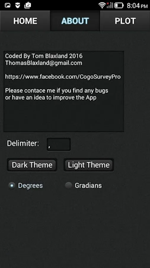 Settings---> Choose a custon delimiter. Change between a light and dark theme. Change form degrees to gradians.