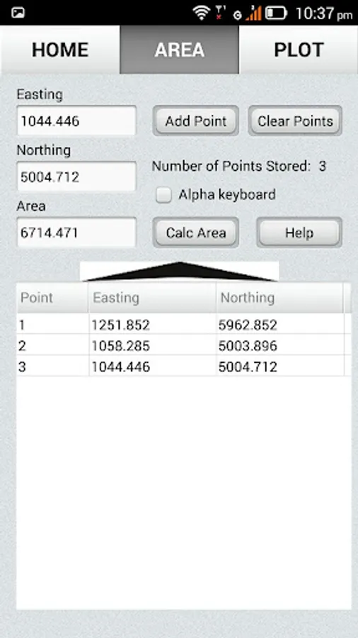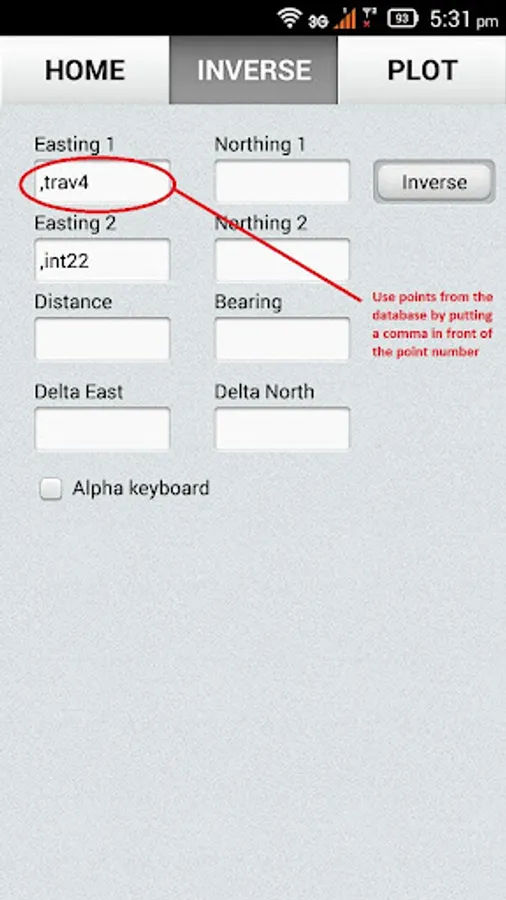 Points Database---> Import a .csv points file or add manually. Points form the database can be used in all the other modules by calling the point number with a comma in front of the point number.(ie ",pt105" in the easting field). Export to .csv and save to internal storage or sand via email.