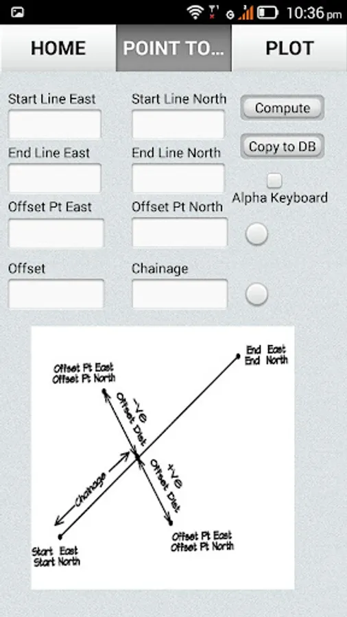 Pt To Line---> Calculate the offset and chainage of a point from a line. Or Calculate coordinates by inputting chainage and offset.