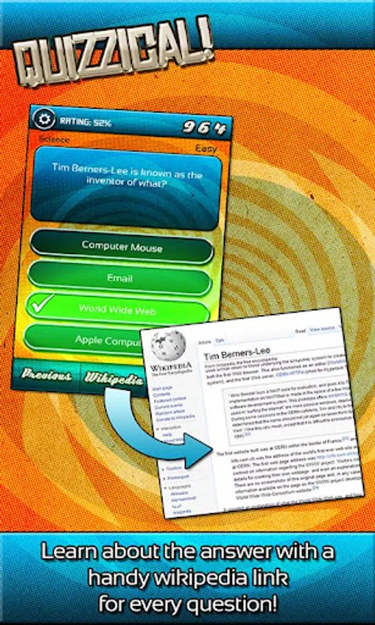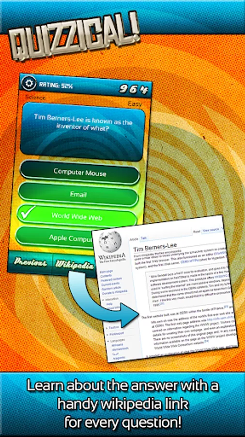 After answering a question, Quizzical provides you with a handy wikipedia link to a related article, should you wish to read up on the subject.