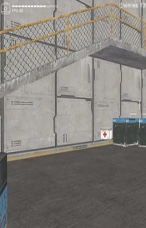 Your task is to explore the base and shoot all enemies. Pick up first aid kits to restore health points.