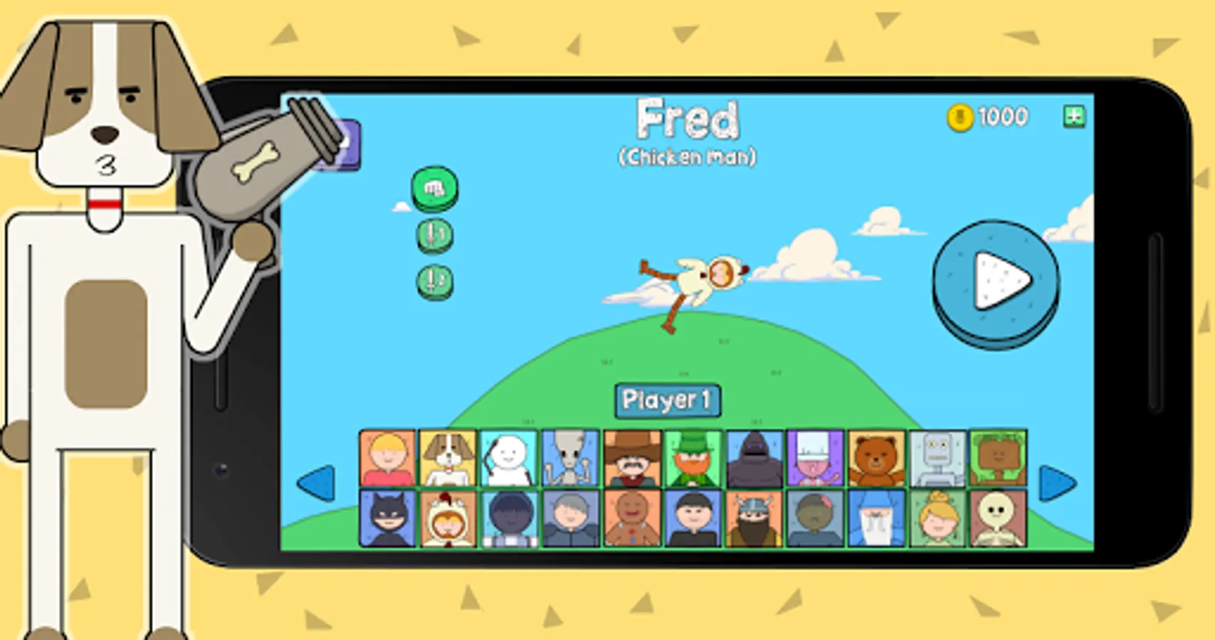 Each character has their own weapons—for example, the dog uses a bone to hit his opponents, the Viking uses his ax without mercy, the astronaut launches his missiles, and Steve (the great hero) uses a BANJO to bash in some heads!