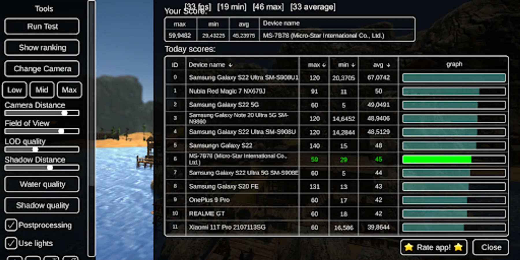 Test your smartphone GPU and CPU and compare it with your friends in online ranking! Get the best device fps score with this tool! You Can change everything in benchmark. Try to change weather, time or graphic quality settings. All with the beautifull pirate island scenery. Try our new option with physics test.