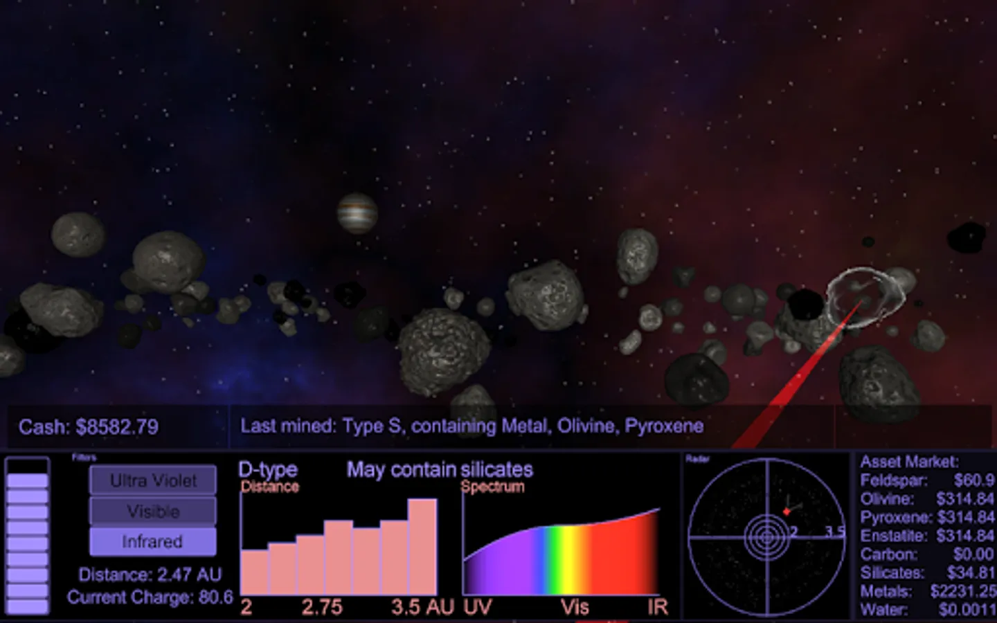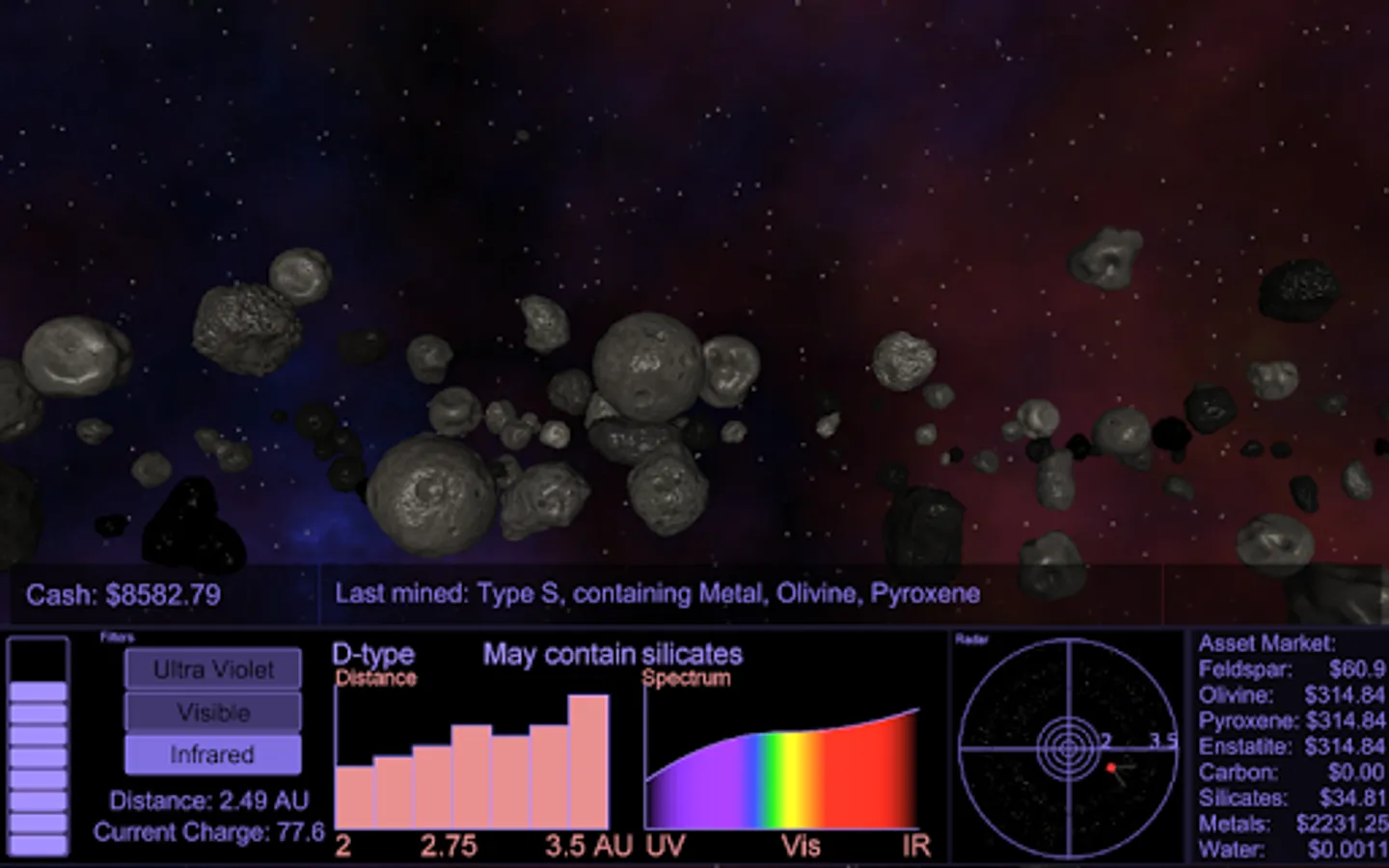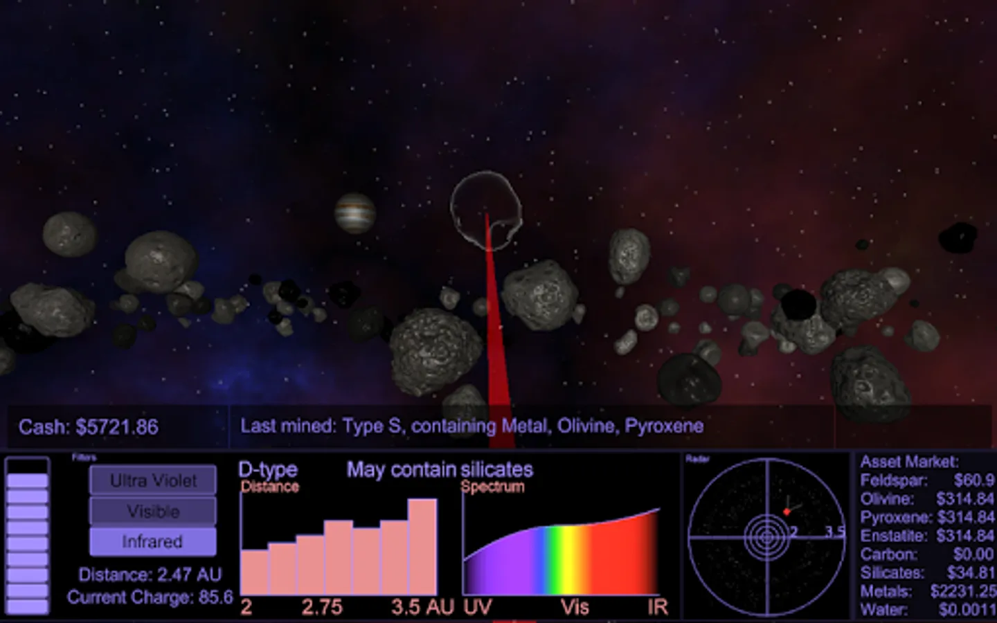 Rocks! Lasers! Profit is video game where you travel around the asteroid belt, searching for valuable asteroids to find. To identify which asteroids give a large cash-out, players have to match the reflectivity of certain asteroids under different spectrum filters to categories of asteroids with expensive metals.
