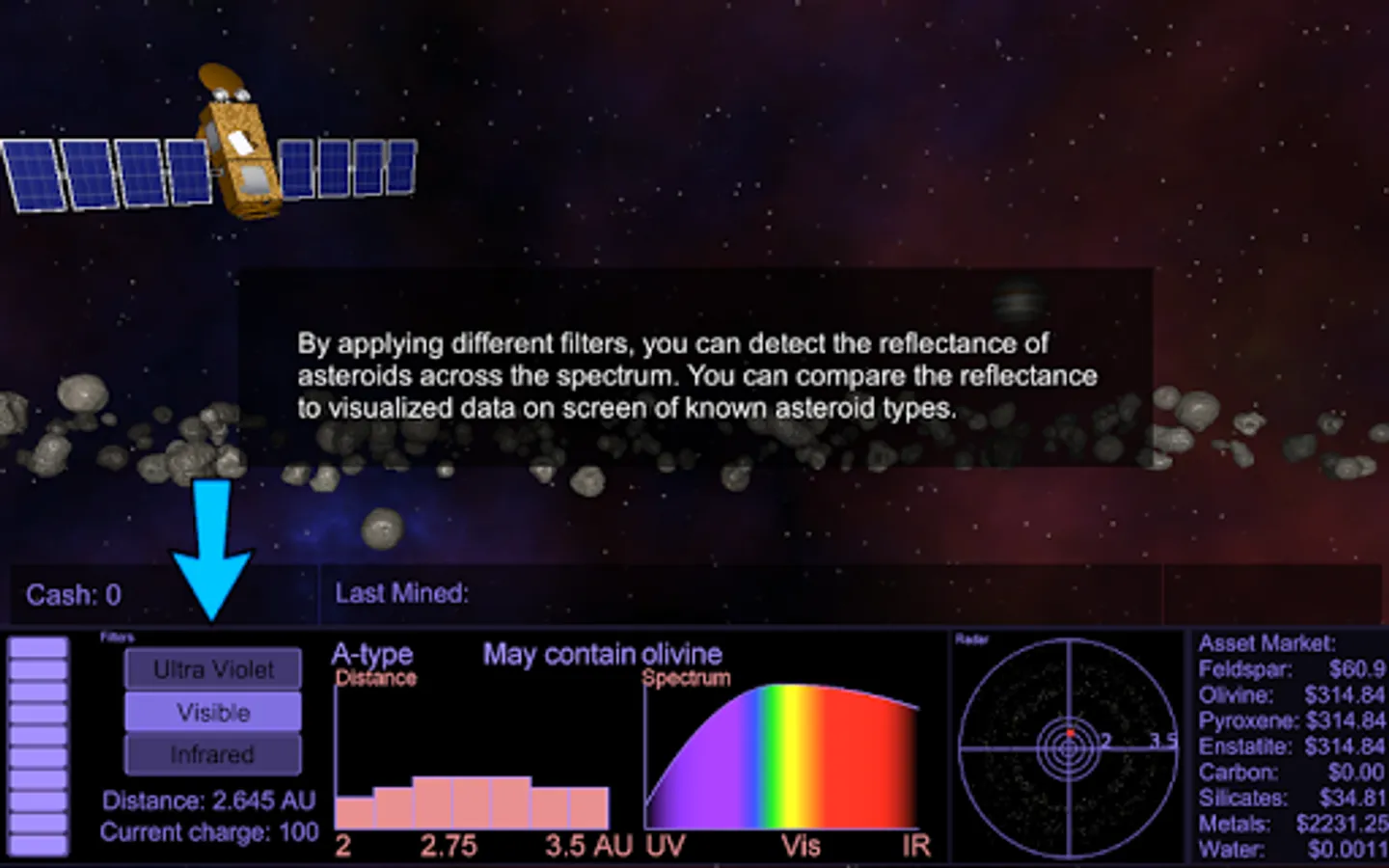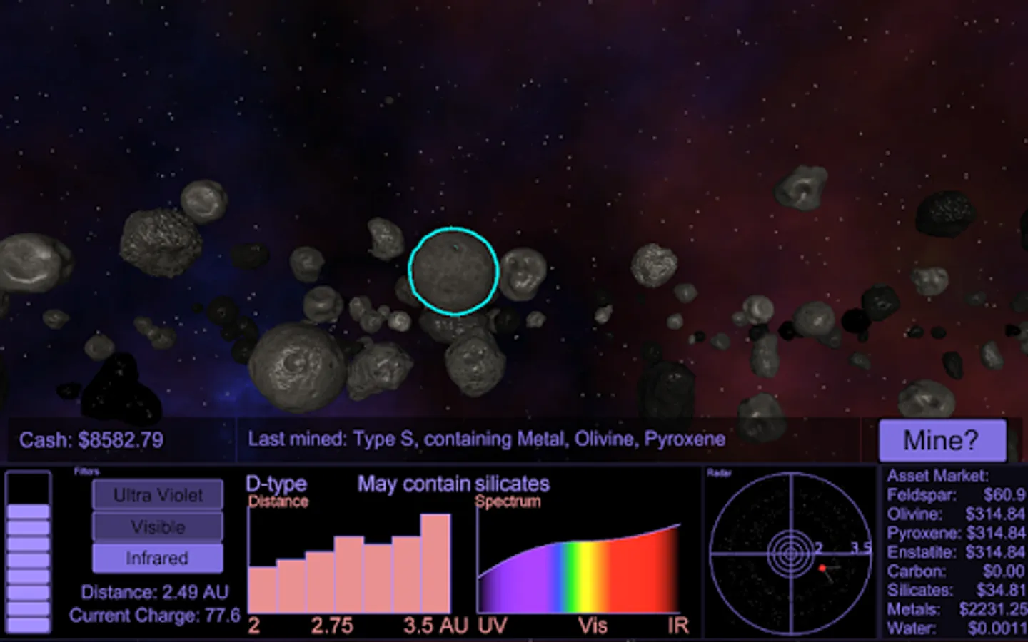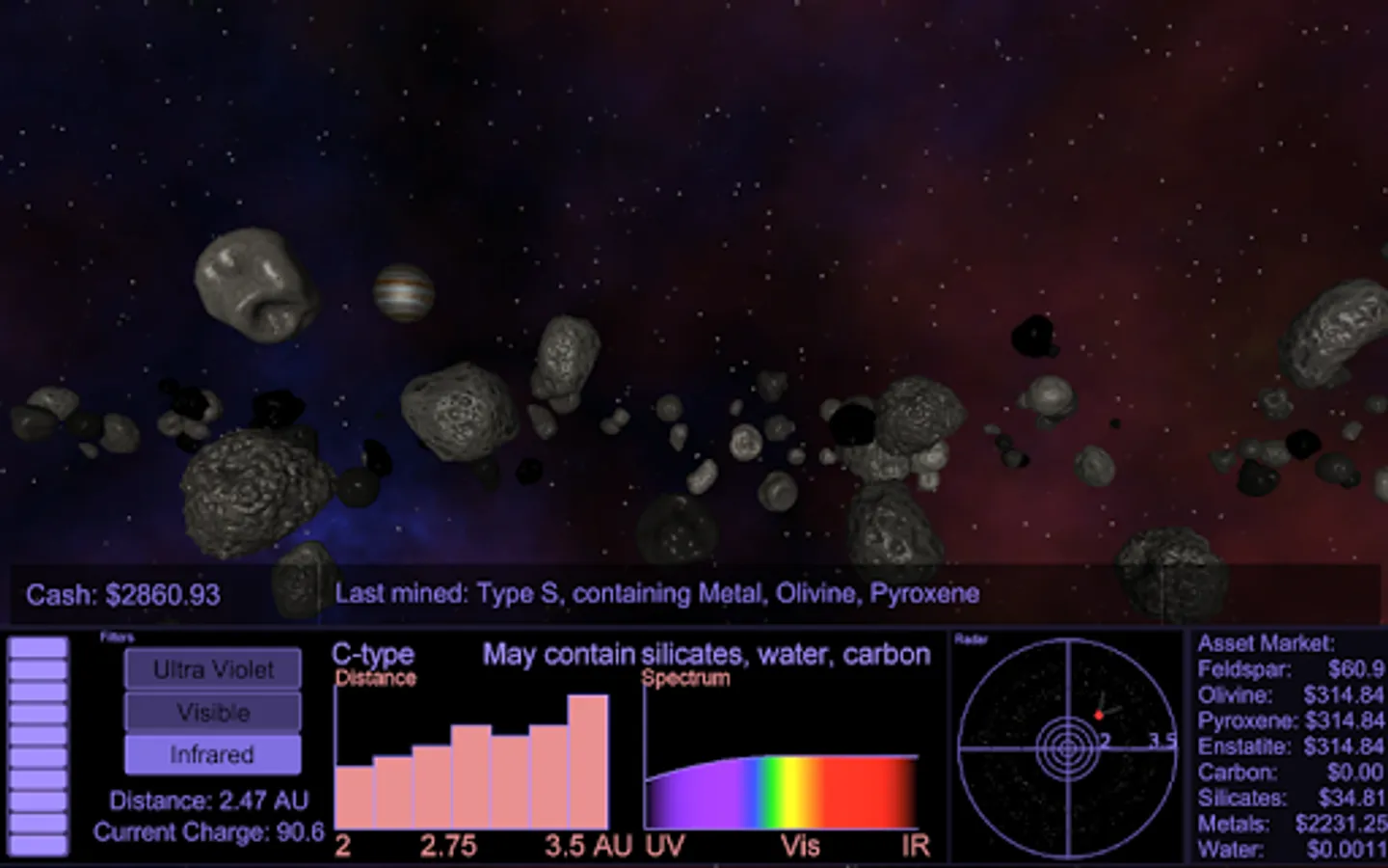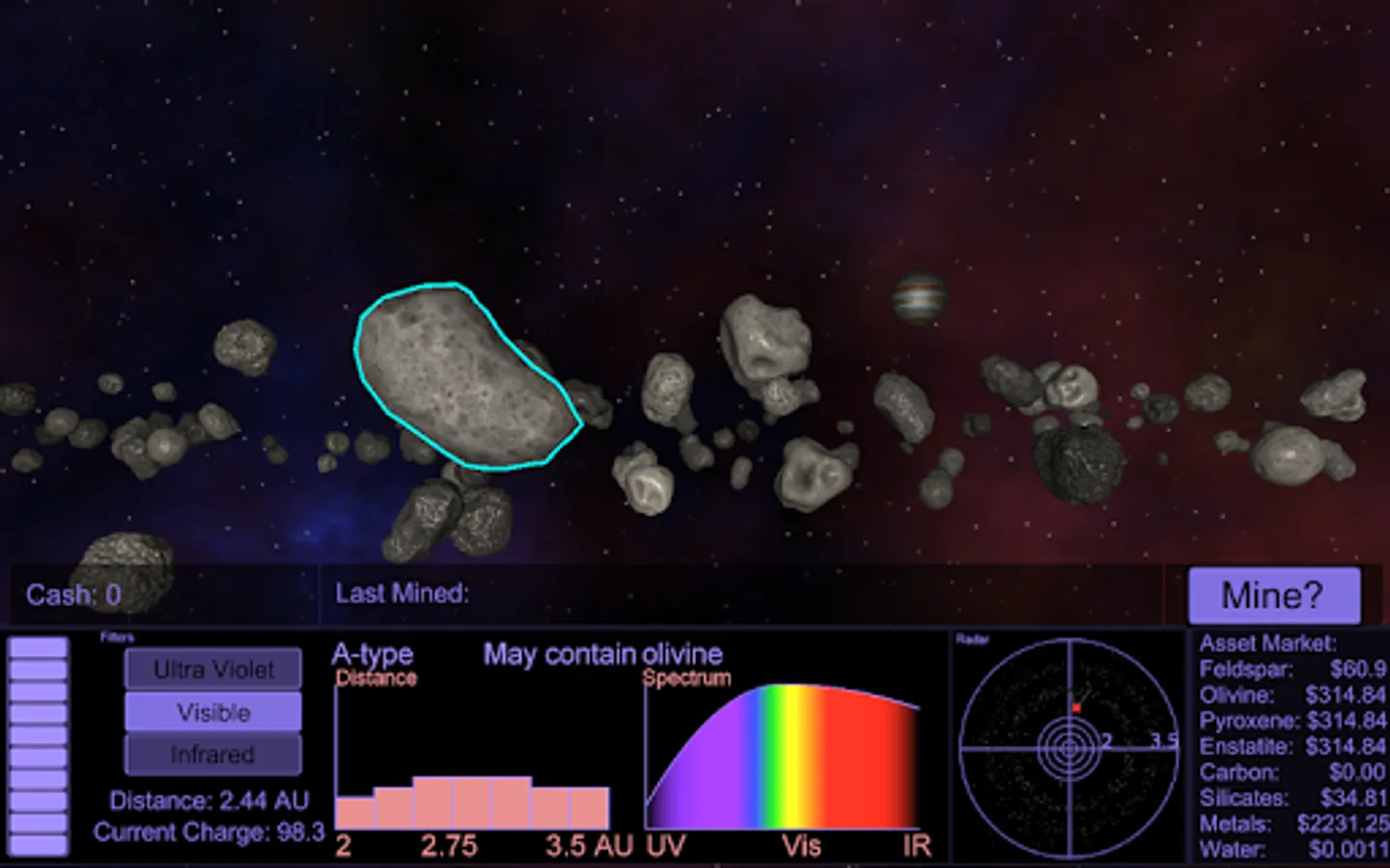 Rocks! Lasers! Profit is video game where you travel around the asteroid belt, searching for valuable asteroids to find. To identify which asteroids give a large cash-out, players have to match the reflectivity of certain asteroids under different spectrum filters to categories of asteroids with expensive metals.