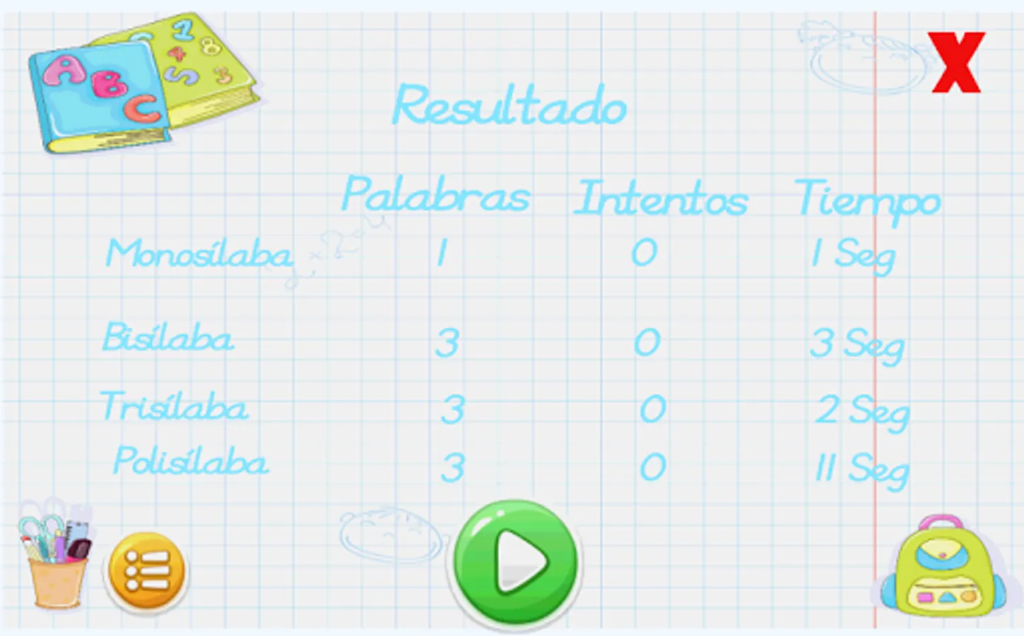 2. Result in each of the games where are detailed the syllable type, time and the attempts.