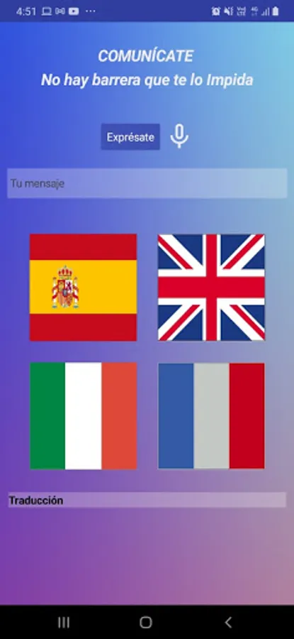 TRANSLATOR: Made so that you can communicate in any of the 4 given languages. There is no barrier that does not allow you to do it. You can write it or speak it with the voice option, depending on your taste.