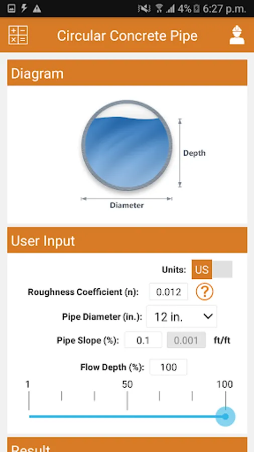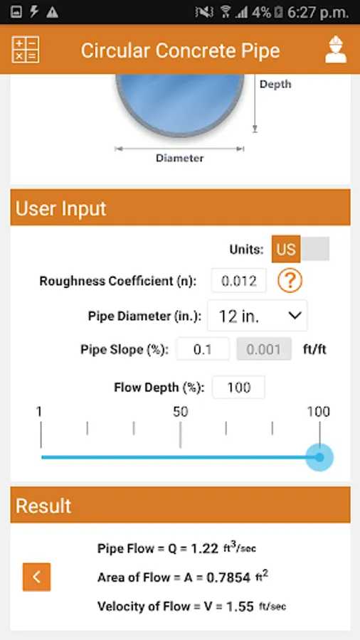 Compare Flow app uses Manning Formula, the most widely accepted formula for evaluating the hydraulic capacity of non-pressure sewers.