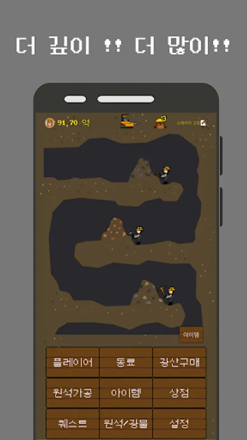 Strengthen miners, hire colleagues, buy mines, and complete quests