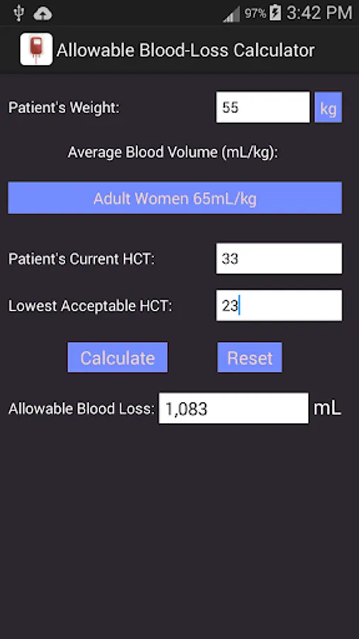 An allowable blood loss calculator suitable for immediate convenient access. The ABL Calculator uses the information you submit to determine your patient's allowable blood loss for his/her lowest HCT (Hematocrit). Our product is useful for a wide range of medical practitioners including, but no limited too, anesthesiologists, surgeons, trauma surgeons, physical assistants, nurse practitioners, residents, and medical students. Whether used in the clinical setting or for educational purposes, the intent of the ABL Calculator is to provide a fast calculation tool, rather than any form of guideline and is not a substitute for clinical judgement.