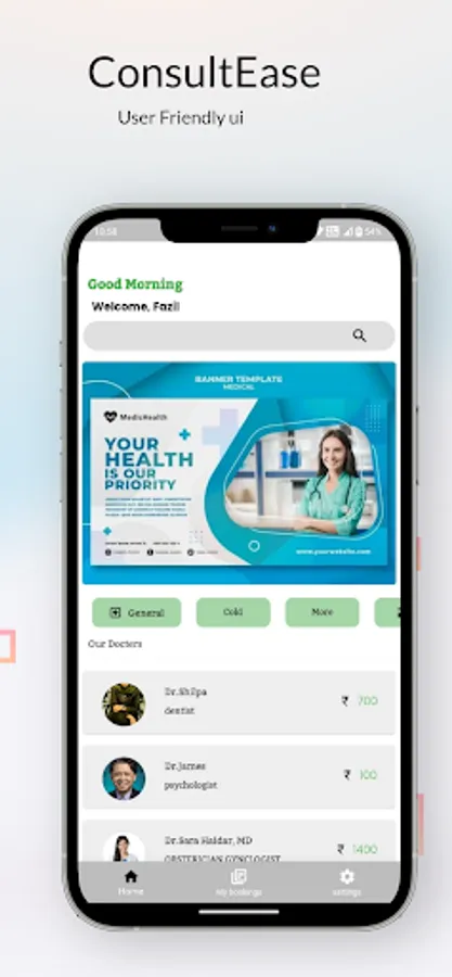 "Consult Ease is a user-friendly and comprehensive app designed to offer a seamless healthcare experience, closely resembling the functionalities of a hospital app. With Consult Ease, users can easily connect with qualified medical professionals, schedule appointments, access medical records, receive timely reminders for medications, and securely communicate their health concerns. Just like a hospital app, Consult Ease prioritizes convenience and efficient healthcare delivery, ensuring that users can access quality medical care and guidance from the comfort of their devices."