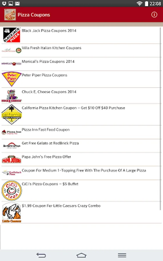 Love eating pizza? Then download this app and enjoy your favorite meal at discounted prices. We regularly look for rebates, savings and coupons from popular pizza restaurants and update the app.