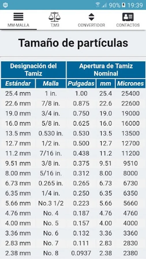- Table of Size of particles (Millimeters, Mesh (Mesh), Inches, Microns);