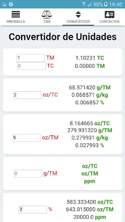 - Units converter (TM, TC, oz,%, ppm, kg, g).