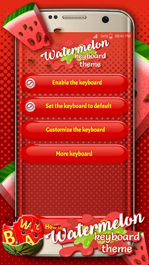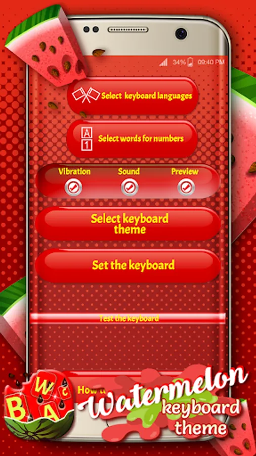 Return to the application, select ‘Set the Keyboard to Default’ button and select 🍉 Watermelon Keyboard Theme 🍉 You can now customize your keyboard (choose themes, languages and shortcuts)
