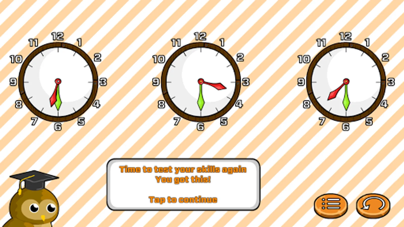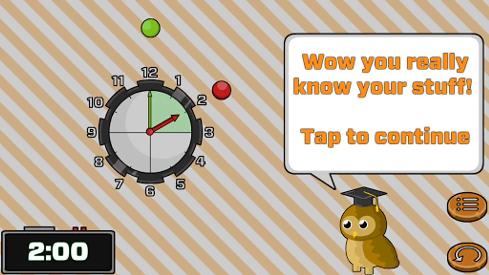 Owl Teach You Time is an education game about analog time, Aided by a wise old owl you gradually learn how to use and understand analog clocks. The game carries the player from the very simple to the more complex workings of analog time, meaning the player can begin with little to no understanding and finish with confidence, learning at their own pace in a positive, relaxed and fun environment!