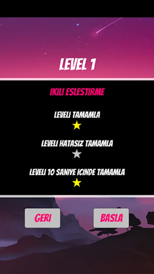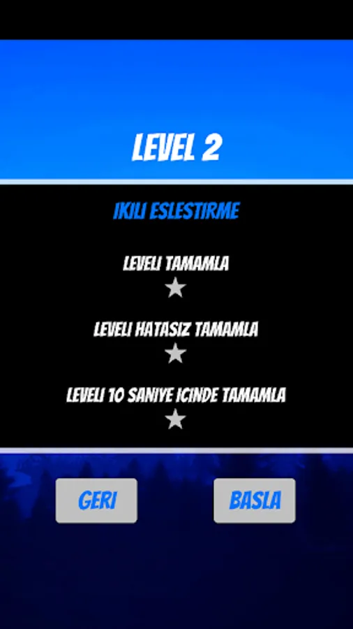The first 5 levels of my memory game, which consists of 8 levels in total, consist of 2-matching, and the remaining 3 levels consist of 3-matching. Each level contains different missions. You earn stars for completing these missions.