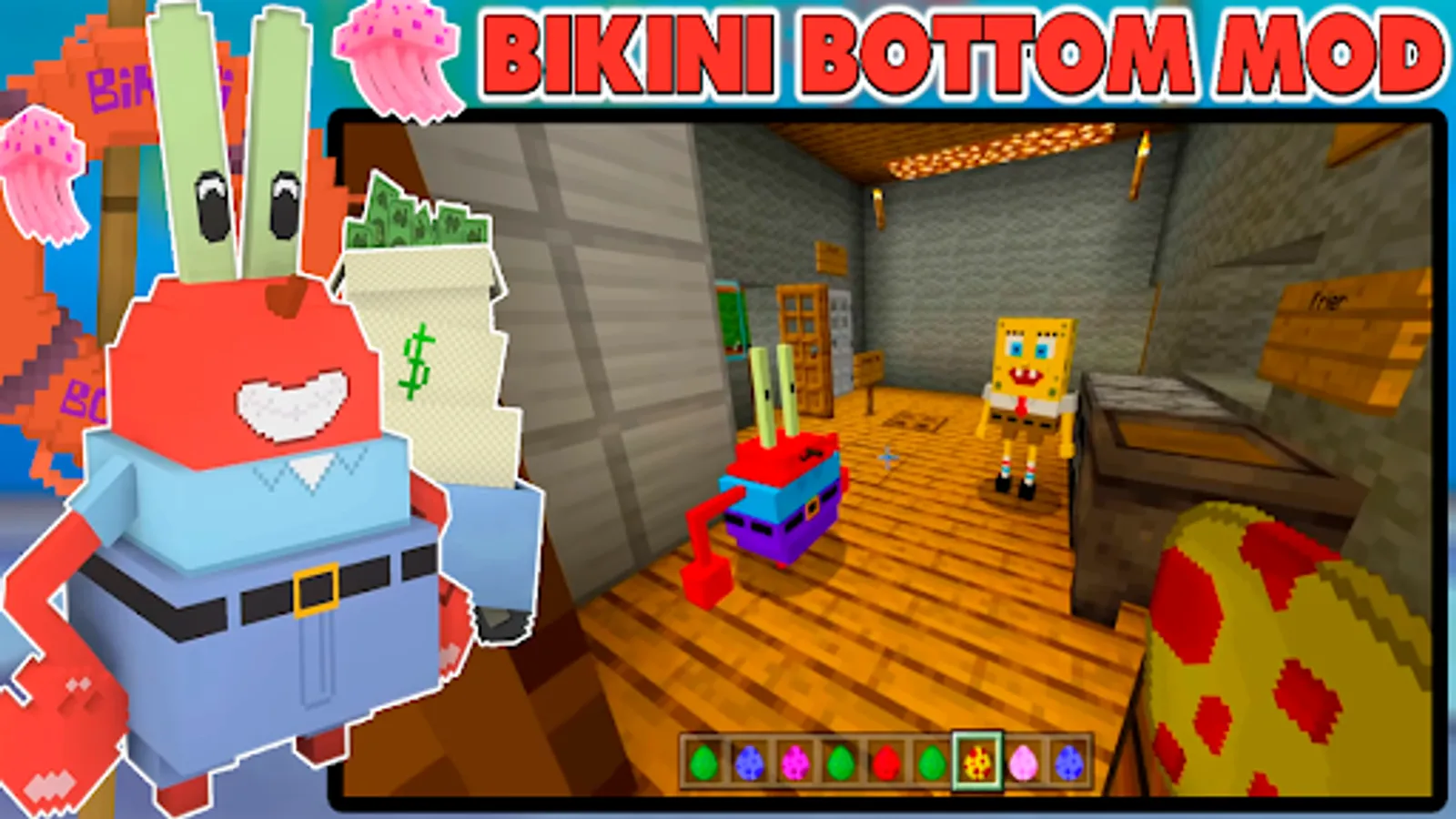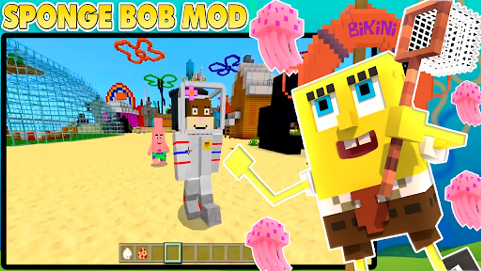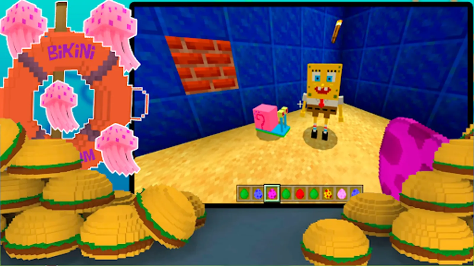 Welcome to the underwater pixel world of Minecraft PE Bikini Bottom Mod, immerse yourself in Minecraft Badrock cubic biomes that will bring your favorite NPC characters and settings from the popular animated series to life in your favorite blocky MCPE game for boys and girls. In addition to the best Minecraft SpongeBob mod, you will have access to a unique custom Minecraft map Bikini Bottom, which takes up little space on your Android device, but is very cool and colorful. Explore a massive blocky world of coral reefs, kelp forests and sandy beaches as SpongeBob SquarePants, Patrick, Squidward and the gang embark on thrilling adventures and challenging quests in Minecraft Pocket Edition. Explore, craft and build your own block house, decorate it with iconic items like pineapple houses, Krusty Krab signs and jellyfish lamps. Or create your own underwater survival mode creations using the new Lucky mod blocks and crafting items inspired by the cult series. Travel through the pixel universe, meet new NPC mobs like colorful jellyfish, sea turtles and the supervillain Plankton, and fight epic bosses in the arcade game for boys like King Neptune and the Flying Dutchman. Use new crafting weapons like jellyfish nets and bubble shooters to protect yourself and your friends, or move faster around the MCPE map in new vehicles like the Patty Wagon and Aqua Glove. Free Minecraft Sponge Bob mod is an excellent chef and can cook a variety of dishes, including the legendary Krabby Patties, which are one of the main dishes in the cooking simulator game for girls. Install your favorite Minecraft skins on your phone for free. Stop the evil Plankton from stealing Mr. Krabs' legendary Krabby Patty recipe. Craft block games for teenagers. Complete tasks and pass tests to complete the popular Sponge Bob game. Gather resources in Minecraft survival mod, build and create unique structures from blocks, become a real Marvel superhero, defeat evil mobs and solve puzzle games for teenagers. Entertaining creative games. Creating and customizing a character on Android. Funny mini dress up games for girls gameplay. Cartoon crafting role playing games for boys. Dress up a popular character, costumes, outfits and accessories. In new Minecraft Lego Sponge Bob addon your playing time will fly by, game content and endless opportunities for creative exploration is a must for Sponge Bob sandbox game fans. The best Minecraft mods for Android. So grab your block pick and get ready to dive into the cartoon adventure. Entertaining board games for your phone. All in all, the SpongeBob free game can be a fun and exciting way to immerse yourself in a virtual fantasy world and play as your favorite characters.