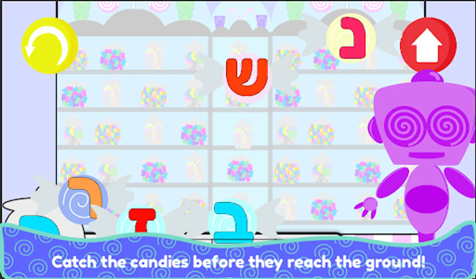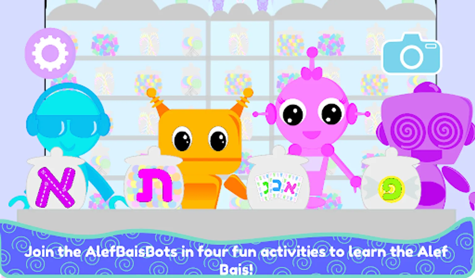 The AlefBaisBots candy store is open for business! Children can play one of the four games to reinforce their Alef-Bais skills: