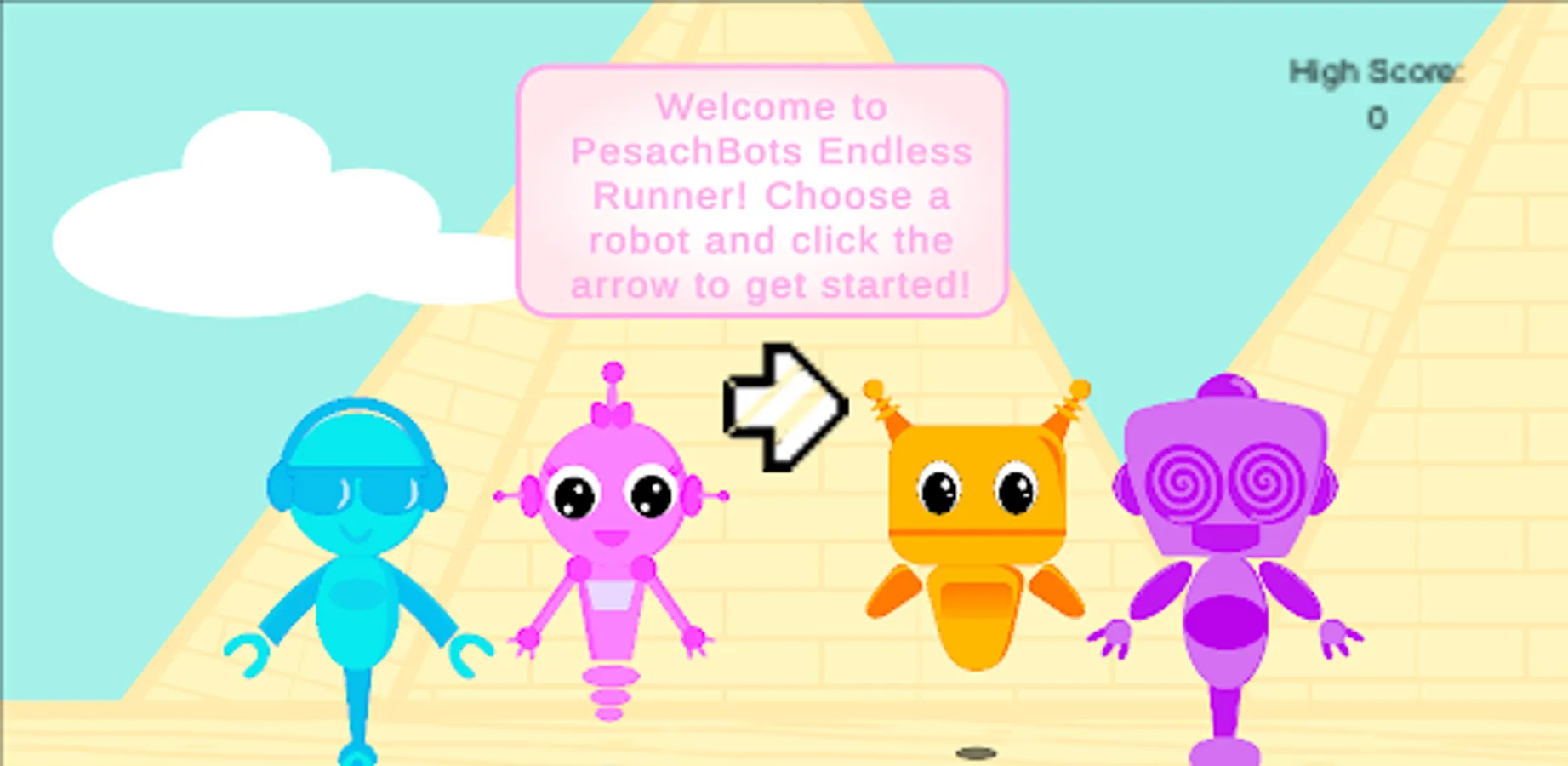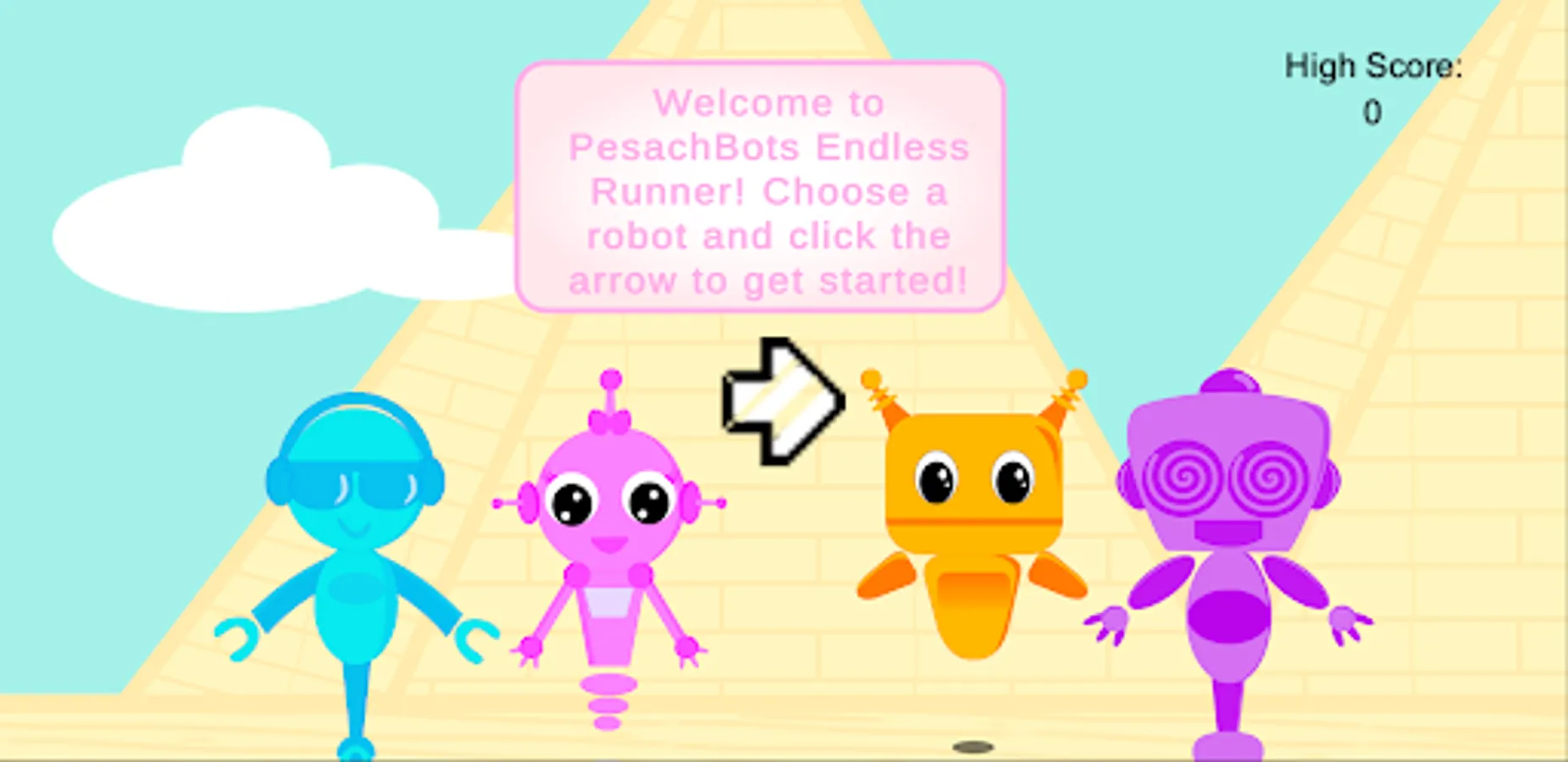 Avoid Egyptians and mummies, dodge lasers, and collect matzos! Choose from four robots and run through the pyramids, or escape through the sea.
