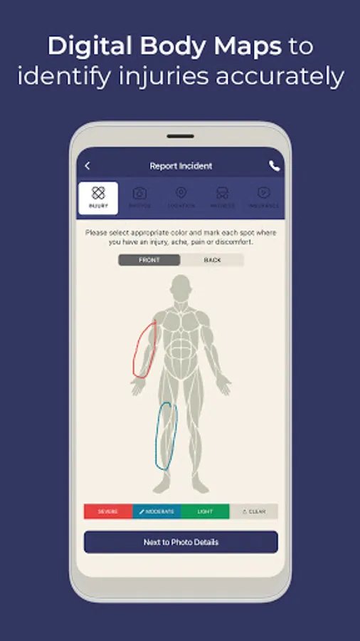 • Incident Reporting kit that helps clients accurately collect and report all necessary information at the scene of an incident using injury body maps, camera, GPS and relevant forms.