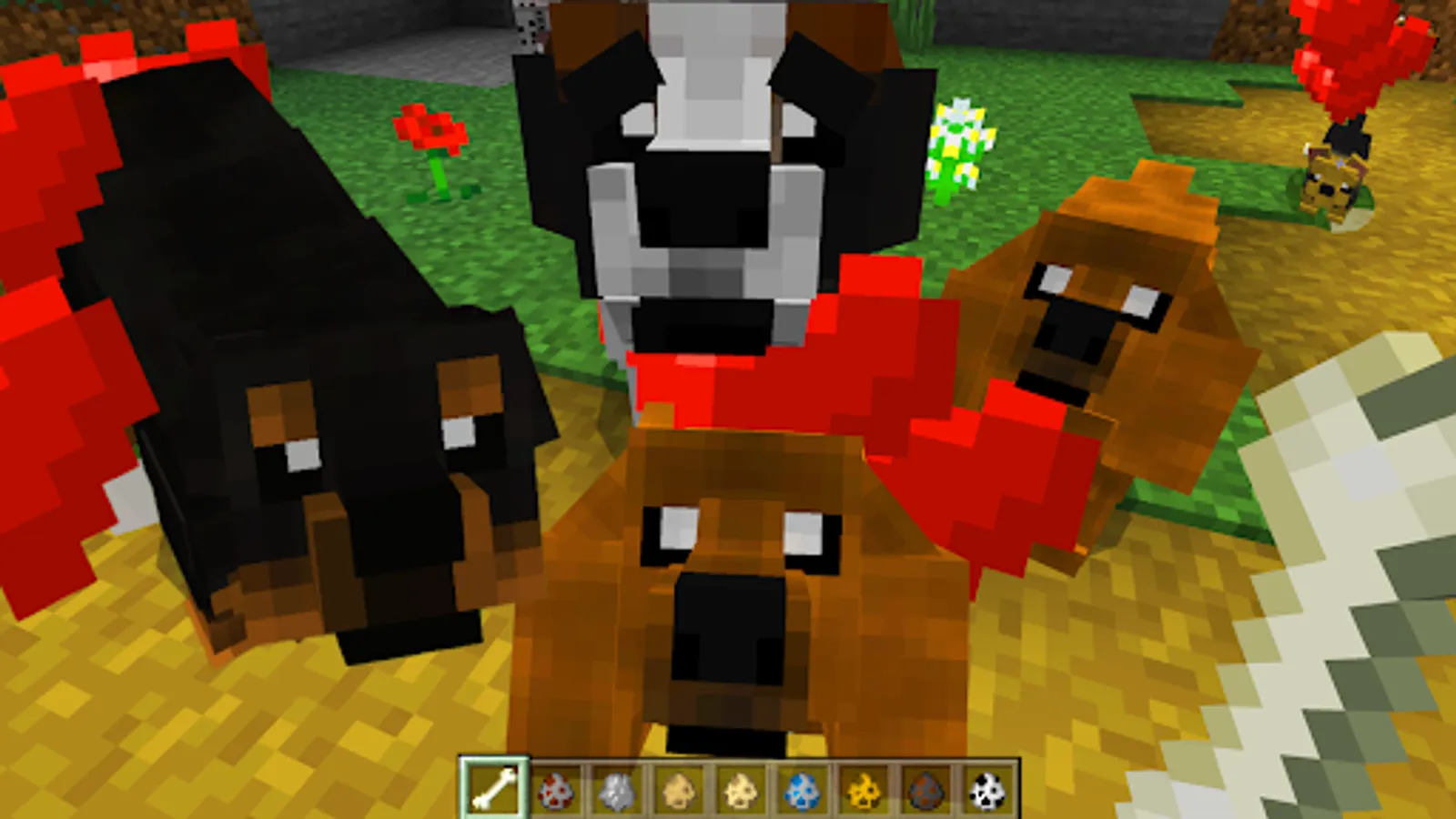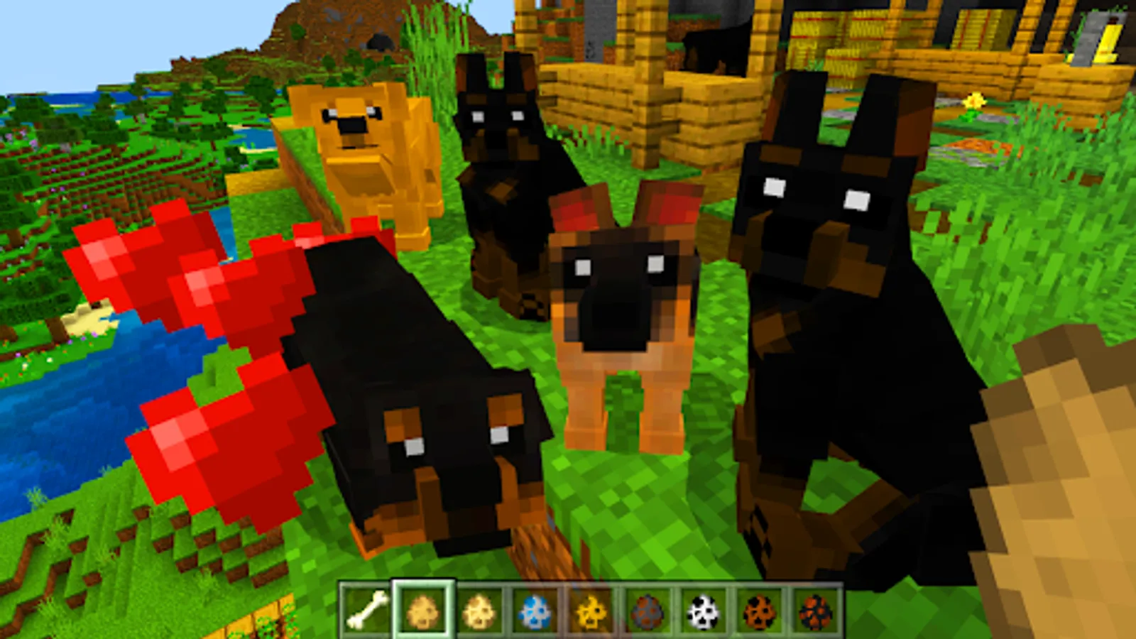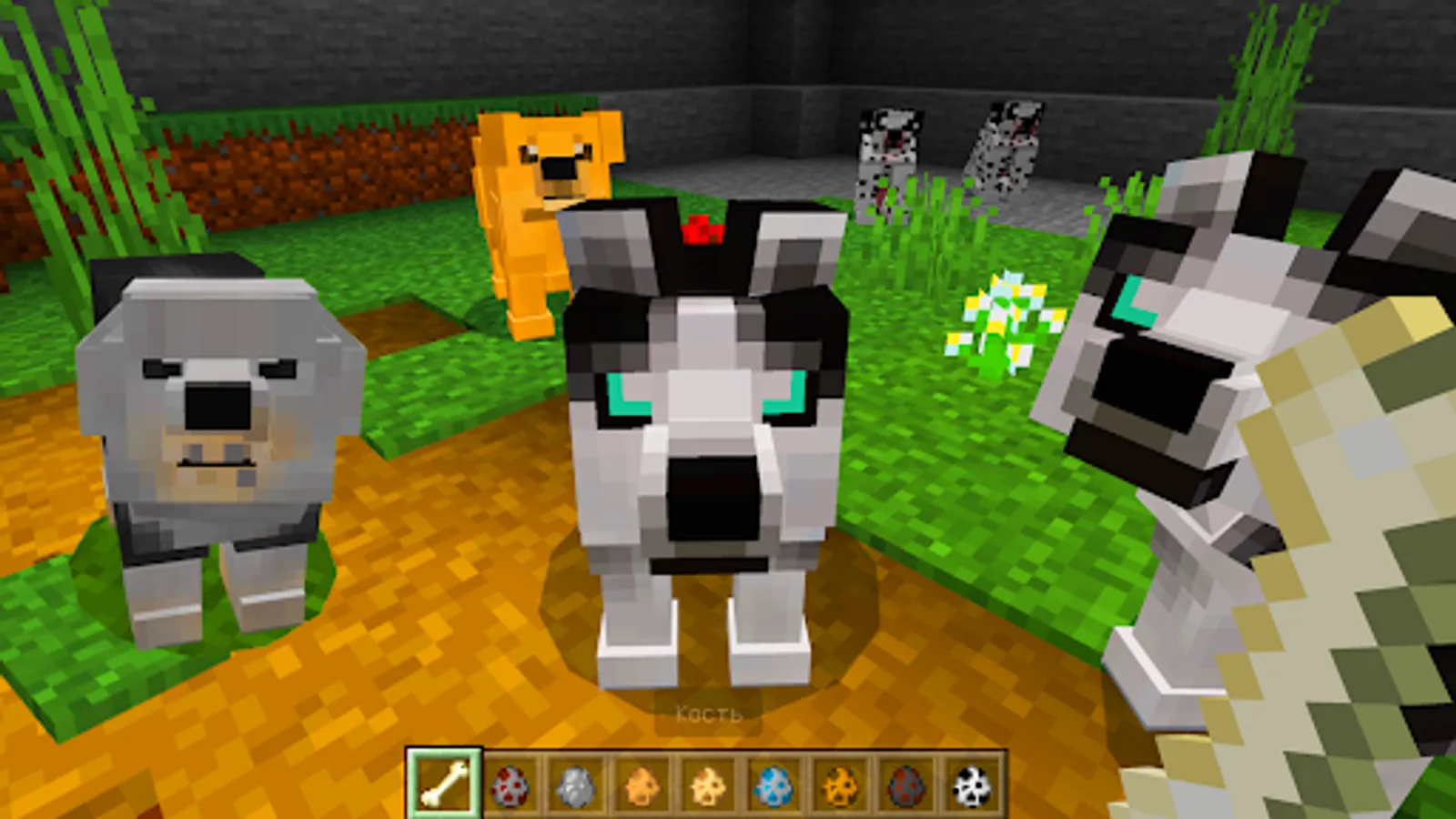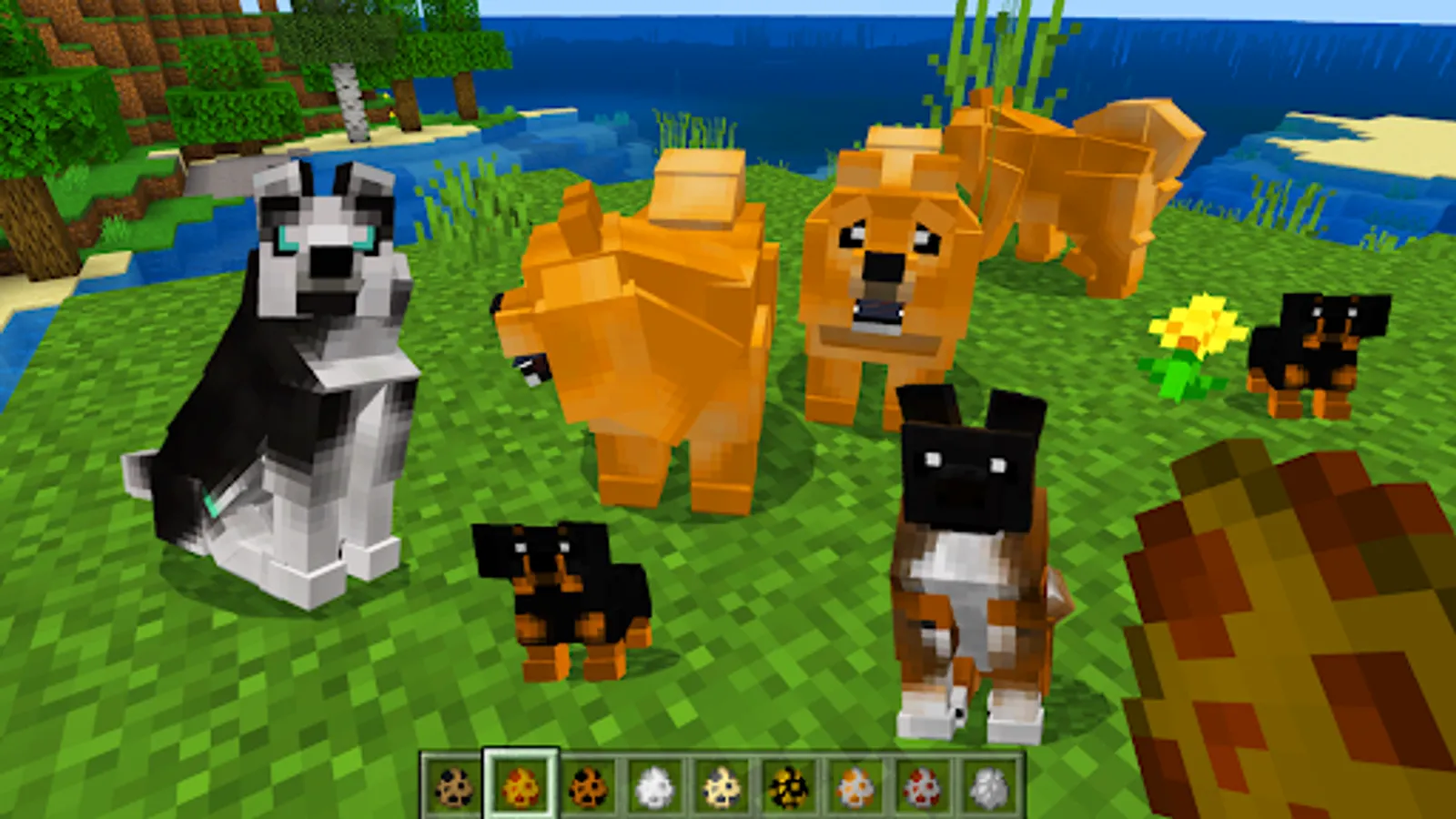 In petworld of Minecraft, you can have an unlimited number of all kinds of pets, in particular, as many dogcraft of various breeds as you like. Moreover, there will be more than 20 breeds to choose from. Naturally, you can tame dogs like wolves. And the behavior will not differ from them. This 4 paw add-on contains 23 dogbreeds from giants to toddlers. Tame them with bone and heal with meat. Cane Corso and German Shepherd, Siberian Husky and Golden Retriever, Labrador and Rottweiler, Dolmatian and Dachshund, Chihuahua and Yorkshire, as well as other breeds of pets. Puppies of all breeds are cute and friendly.