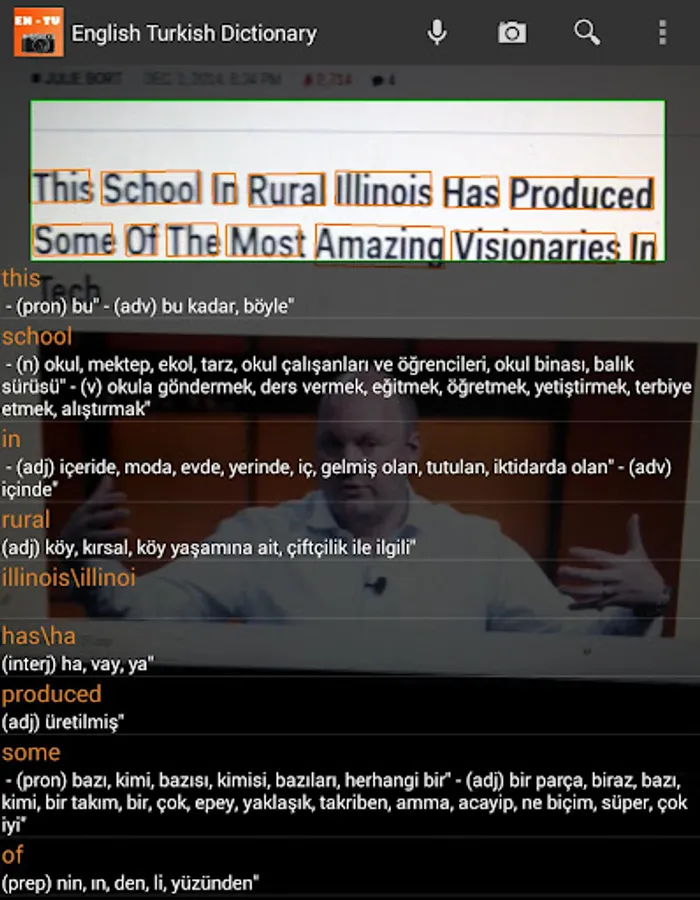 + no need to input text or capture text. It will recognize text and pharse automatically and translate English to Turkish .