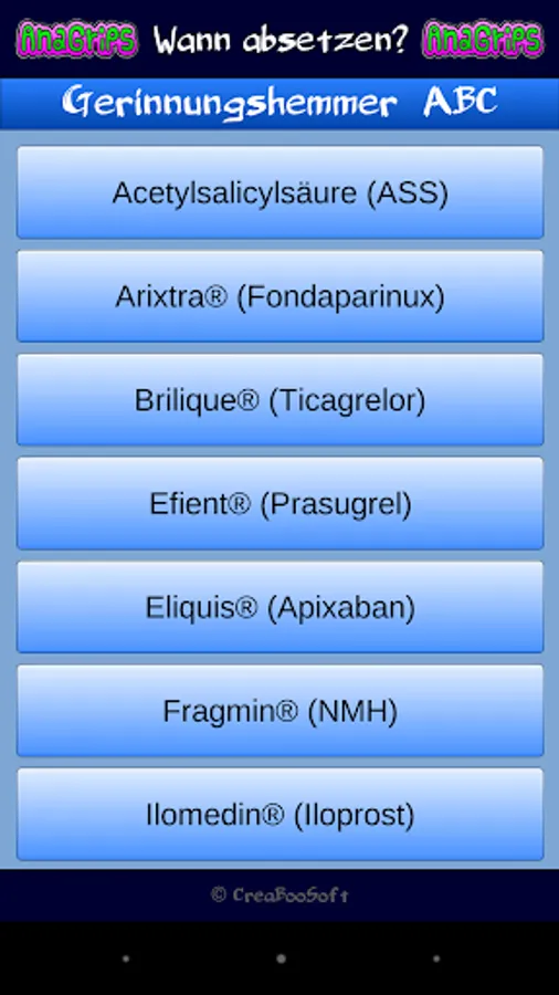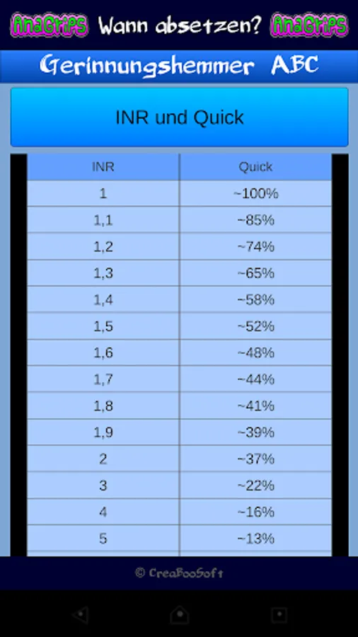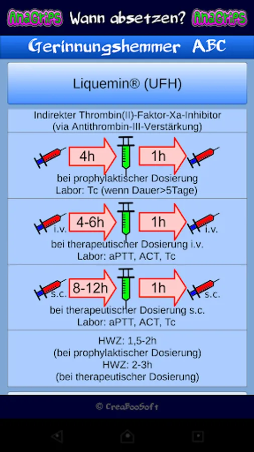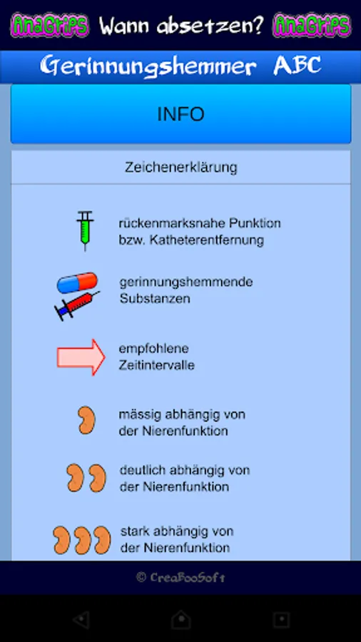 This application is not meant to be scientific work. You should only present contents of the subject. The information contained in this application is based on the recommendation of the German Society for 3.überarbeitete Anesthesiology and Intensive Care (DGAI) on "neuraxial anesthesia and thromboembolism / undertreatment medication (class S1) (http://www.awmf.org/leitlinien /detail/ll/001-005.html). All information is subject to the accuracy or completeness. The use of this application is at your own risk. decisions in clinical setting should be based on an individual and possibly interdisciplinary risk-benefit analysis. suggestions or criticism I take gladly. Use the Review button!