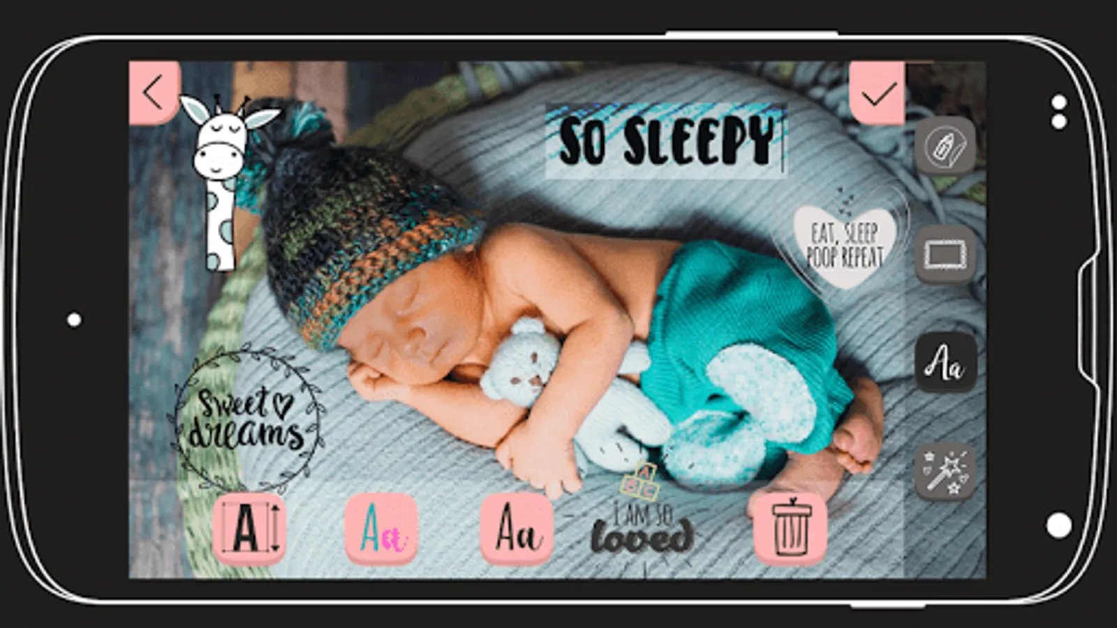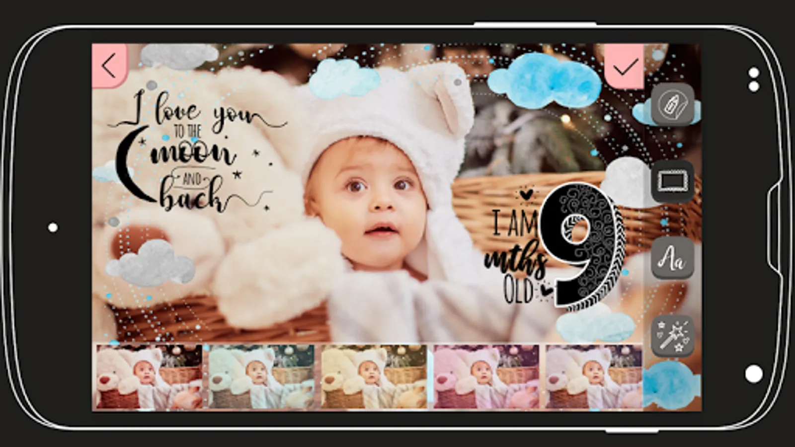 The photo effects that you get with your phone are not enough for you? Install our adorable baby monthly photo app free and find the stickers you want to add to your images. Get creative with editing and pick meaningful decoration. Try all the cute frames and gifs, too! You can also write anything you like using your favorite color and font in this baby pic editing app! Those beautiful monthly pictures will be a perfect memory you can save and share with loved ones. Finally, you can do it all with just one app. There are so many interesting options, all you need to do is explore them all. Now you can use different props for your favorite images and make babies photos edit whenever and wherever you want. Once you design these cherished memories, your little bundle of joy will have the most beautiful images ever. Drop your creations to all social networks, share them with your friends. Download “Baby Story Photo Editor” App free of charge and let everyone see your artistic pictures!