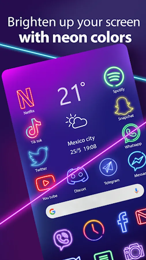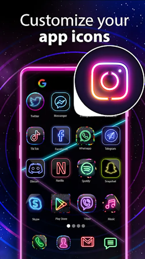 🌞 Change your style and color and illuminate your screen with fluorescent lights in an instant. Download our Neon Icon Designer App free of charge and make your phone display stand out in the crowd. Somewhere out there, there is a neon icon changer app which can not only rename apps icons on your phone screen but also improve their design and style! Yep, you've heard it right! One of the best icon apps on the market can be yours for free, so hurry up and dive into the sea of beautiful neon themes free! Install our Custom Neon Icon Designer App and see below how to use its: