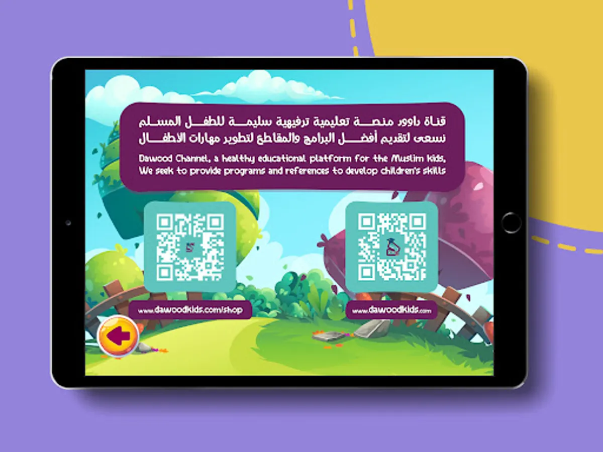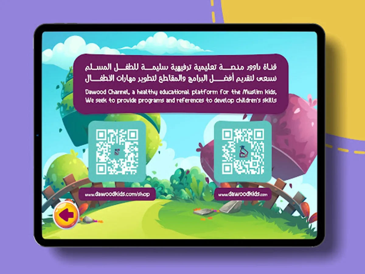 The educational journey through Dawood's Bag by downloading Dawood's Educational Application on your mobile phone or tablet and aiming the camera at the QR code found on the alphabetical cards. This will allow the characters of Dawood and Dana to appear in virtual reality allowing kids to engage with the activity in a smart and unique way!