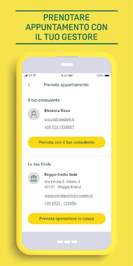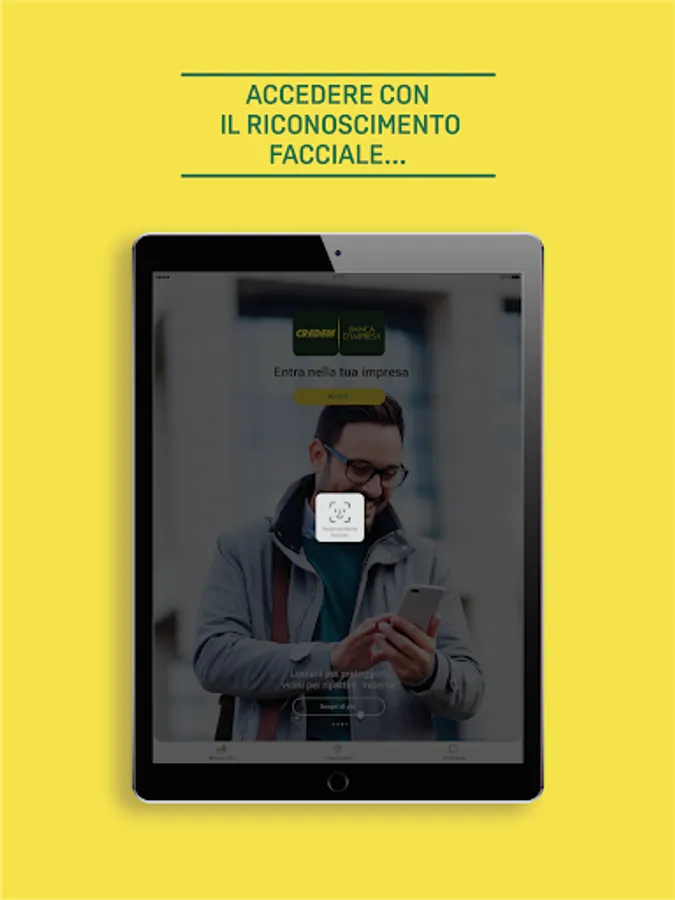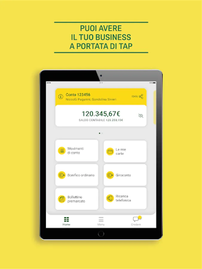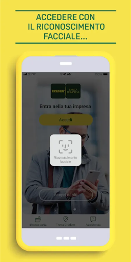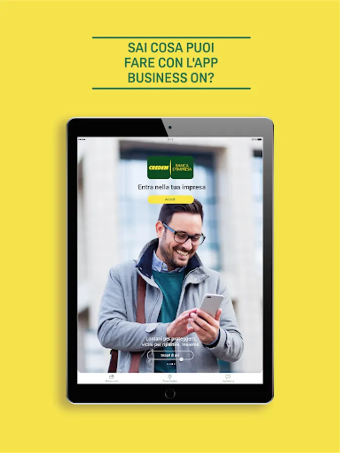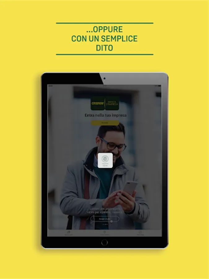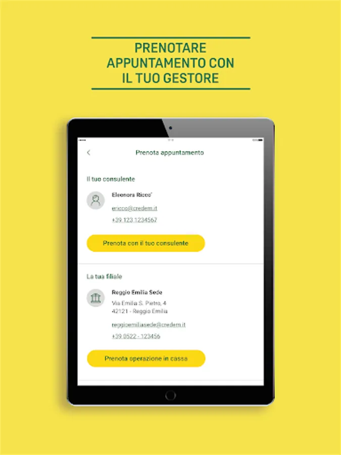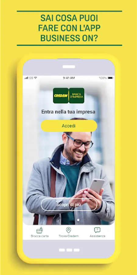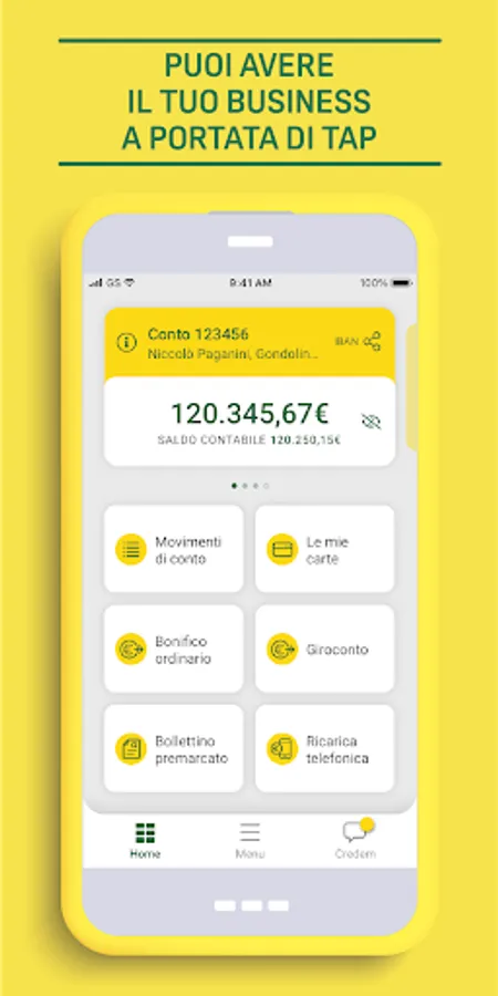 Credem Banca d'Impresa allows you to securely access your Credem account thanks to biometric recognition, manage your cards, your loans, book an appointment remotely with your consultant or a cash operation, make a telephone top-up or pay a bill just like on your Business On.