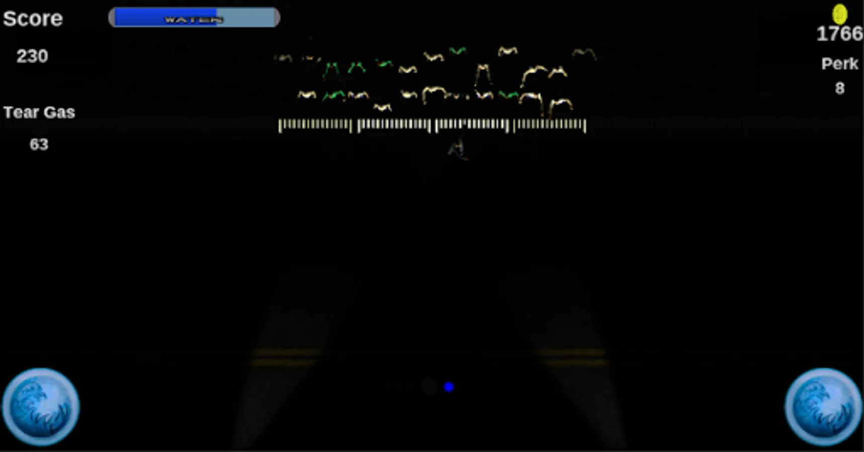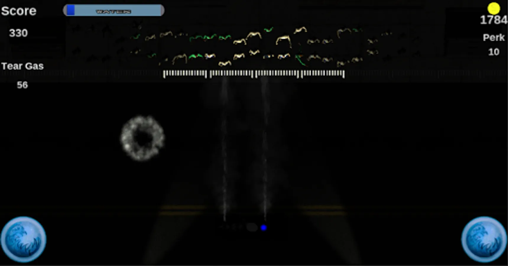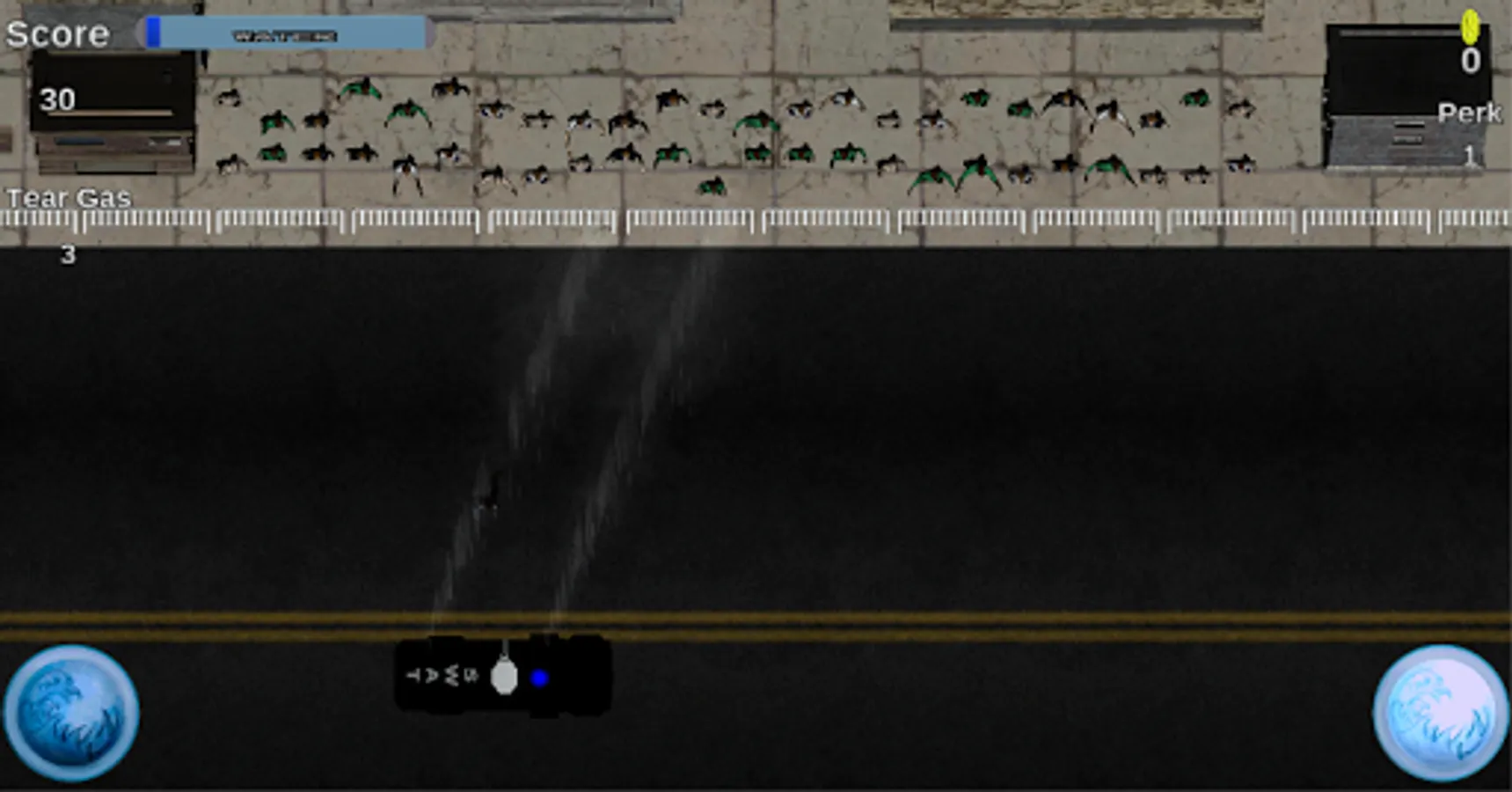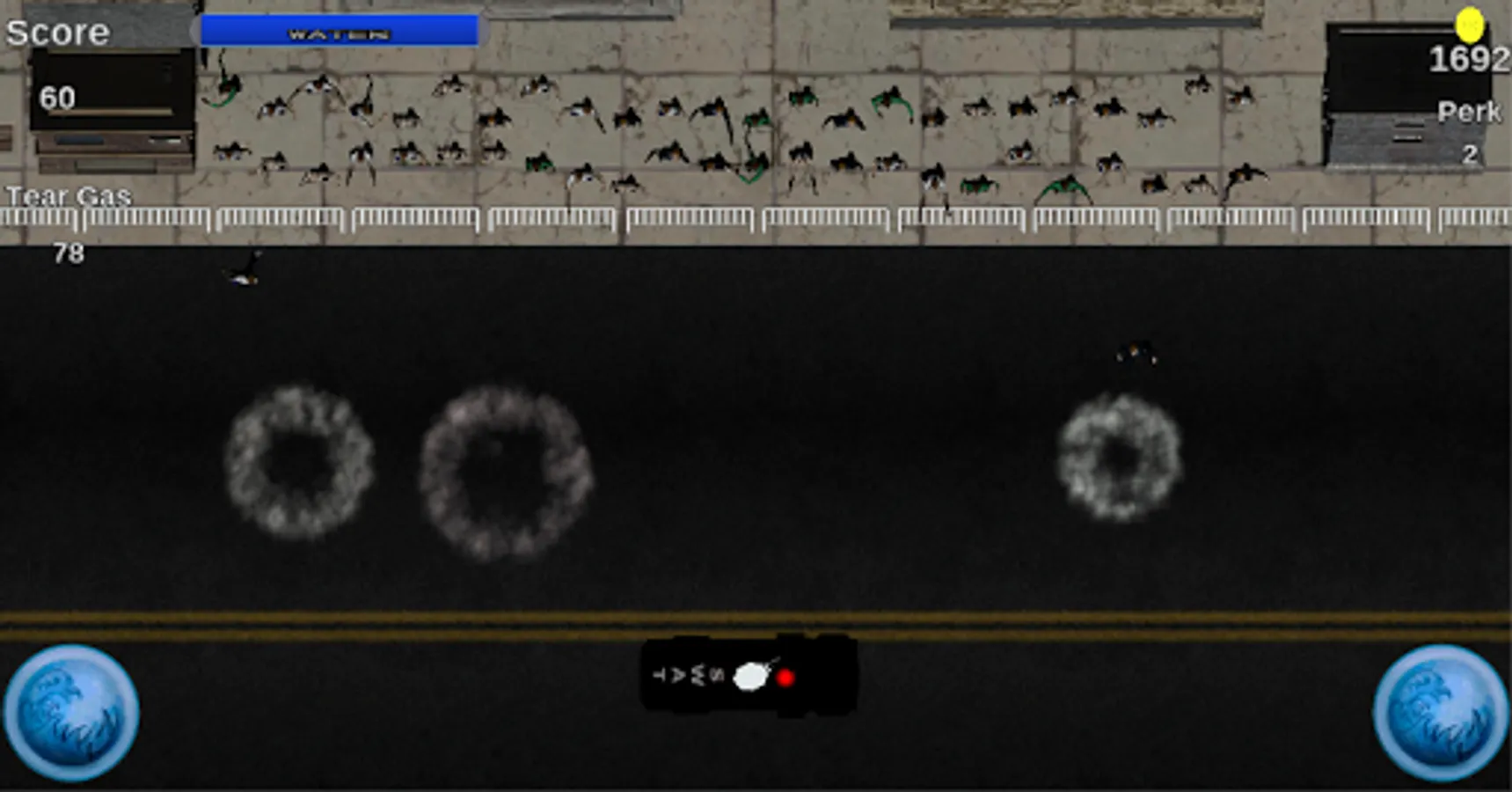 This is Crowd Control. In Crowd Control, you control a SWAT truck that you use to keep protesters back behind the gates. You move the SWAT truck by tilting the device. Use your water spray and tear gas grenades to keep the protesters back by pressing the water spray buttons and tapping the screen. The game gets darker the more waves of protesters you make it through. When it gets too dark, the spotlights will come on. Watch for protesters on fire, they can only be put out with water.