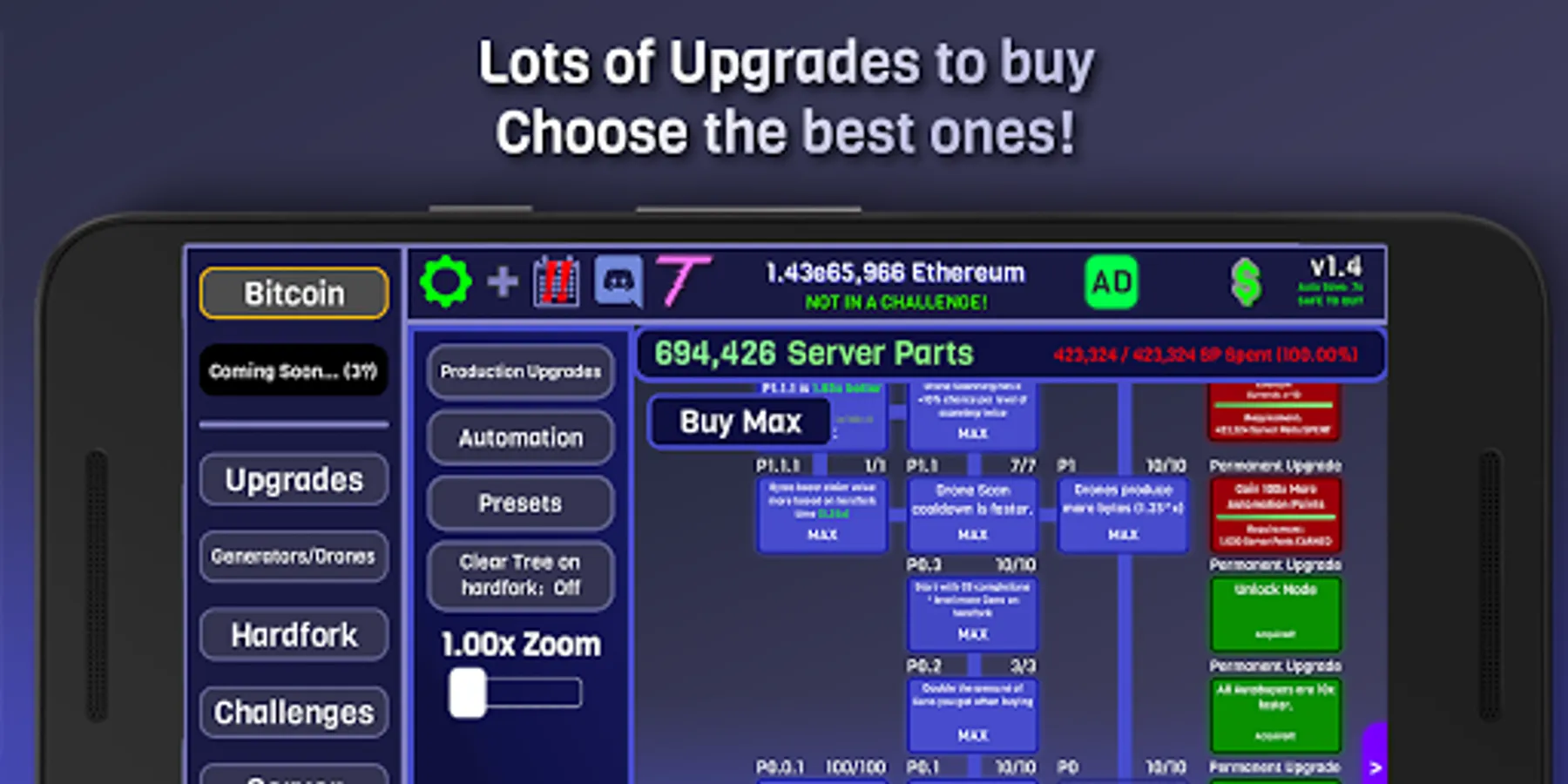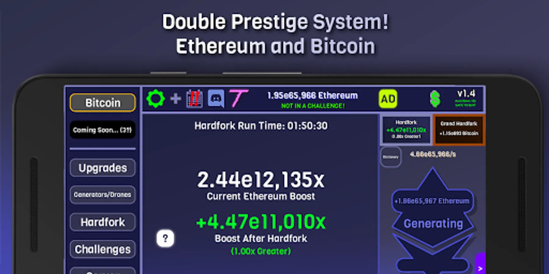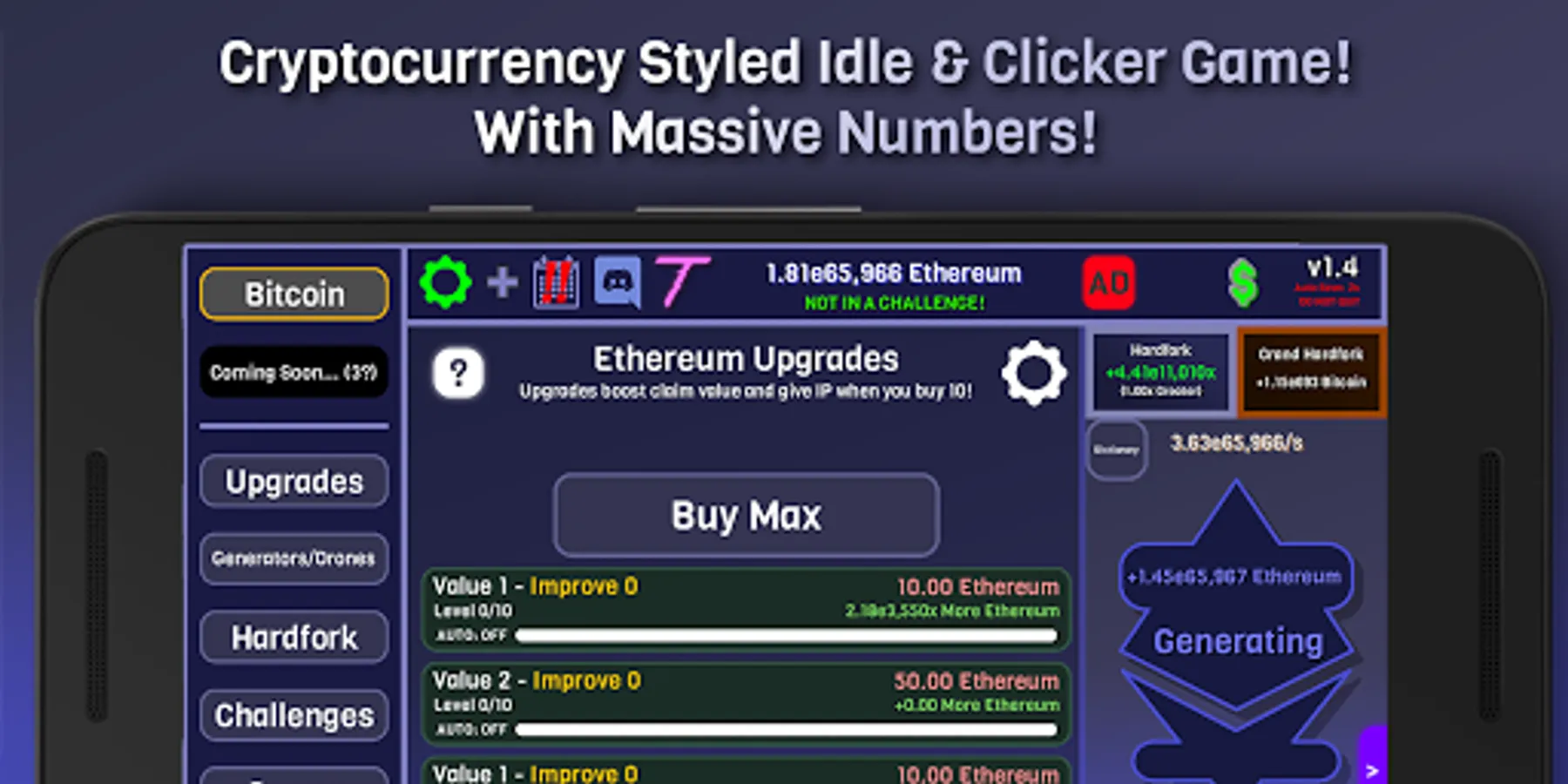 Make as much fake Ethereum and Bitcoin as possible! Buy tons of upgrades, prestige, and unlock many features in CryptoClickers!