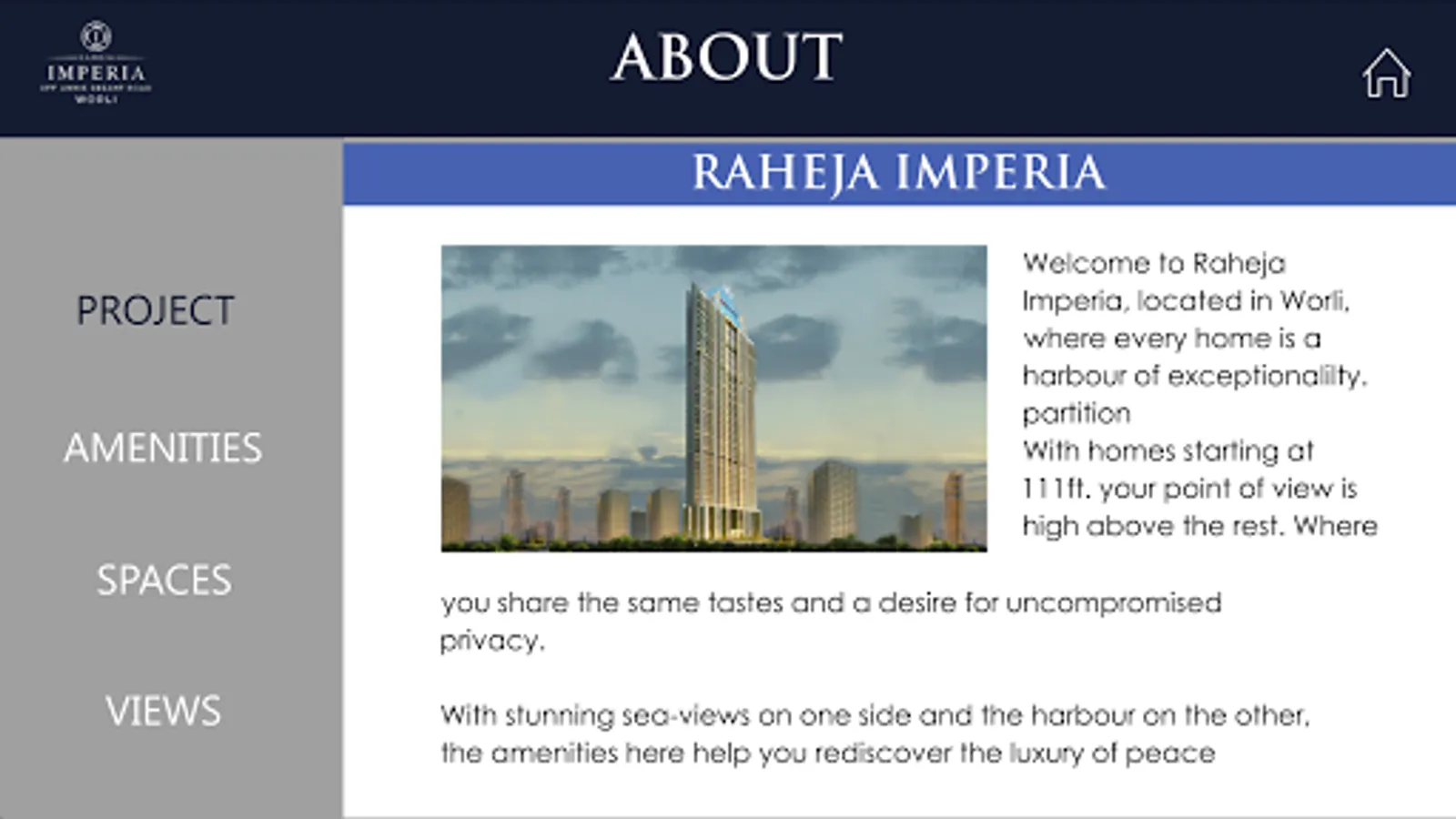 This Raheja Imperia App, by Raheja Universal Group, brings you an innovative way to see the project alive right through your smart phones and tablets. Immersive experience through the new age touch and virtual reality based interactive technology through this application. Get complete information about the project in the About Us section of the app.