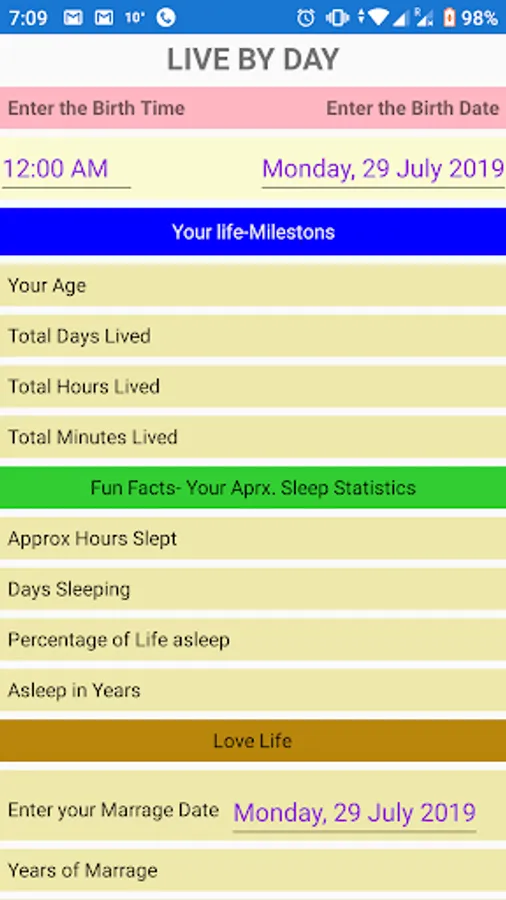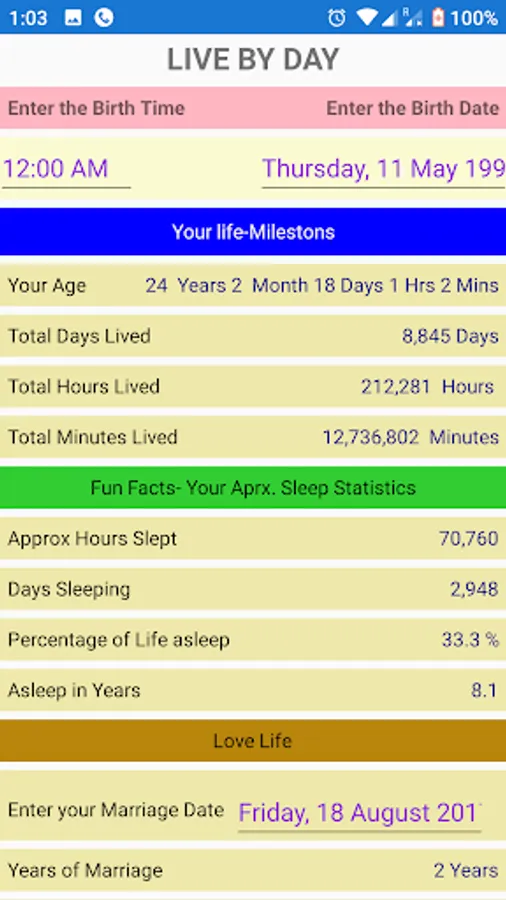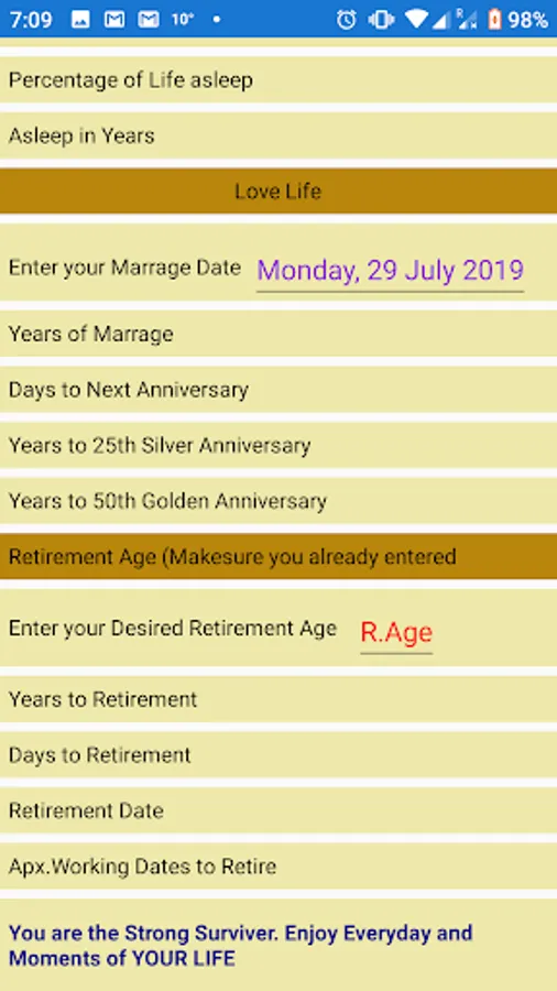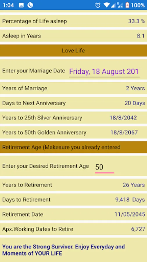 Simple App to calculate your Life Survival Parameters based on input dates of Birth,Marriage & Preferred Retirement Age .Nothing More, Nothing Less.